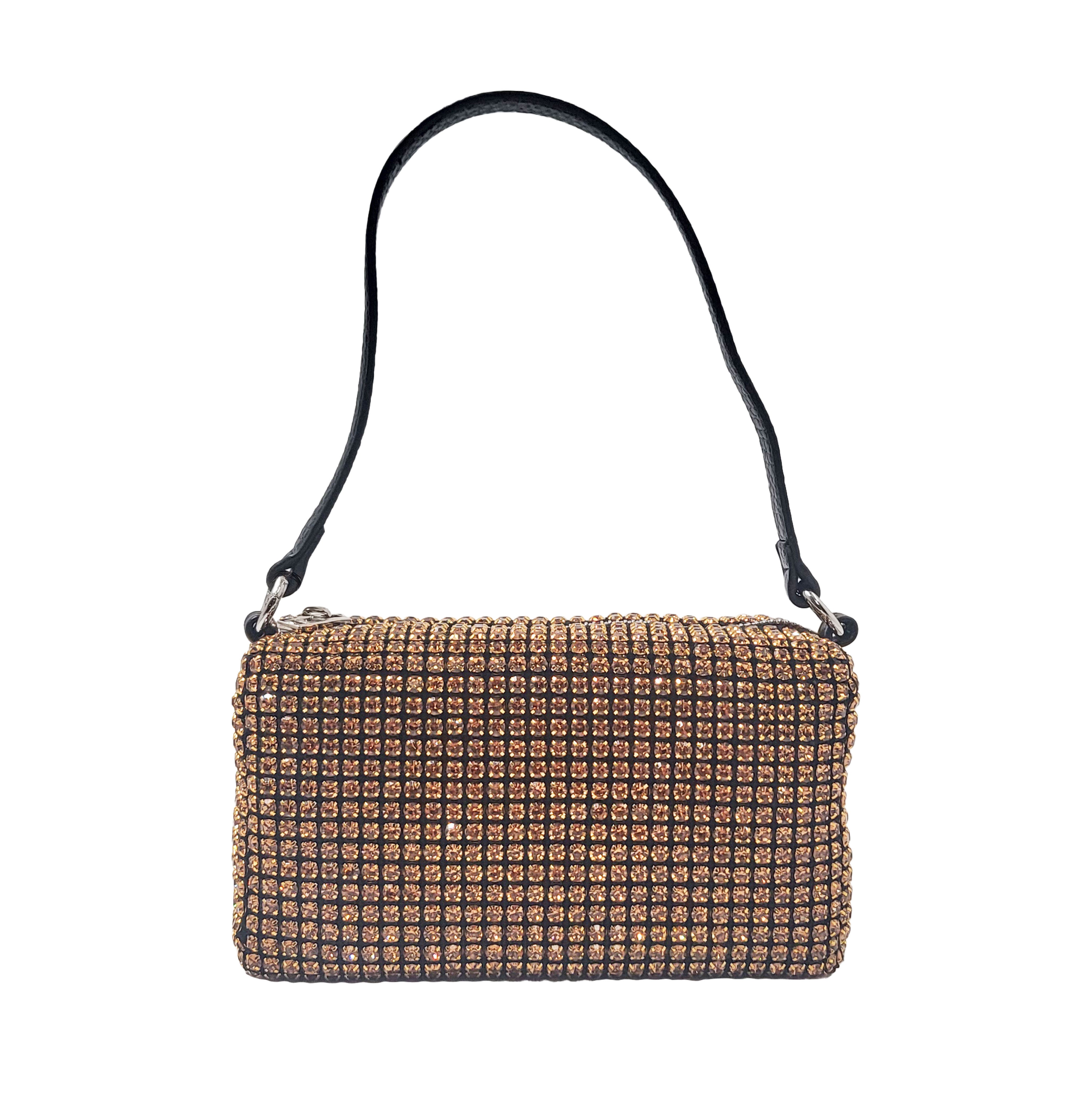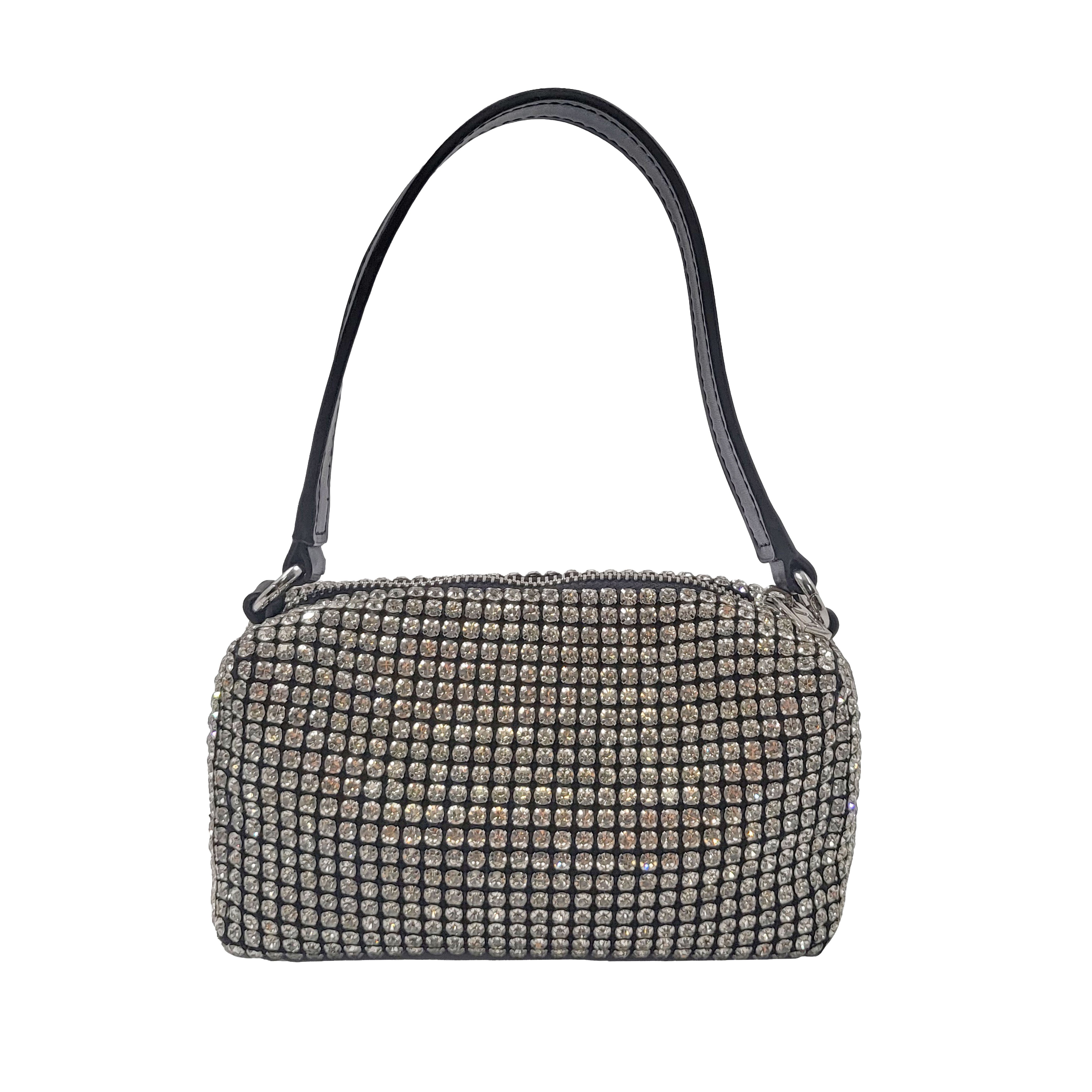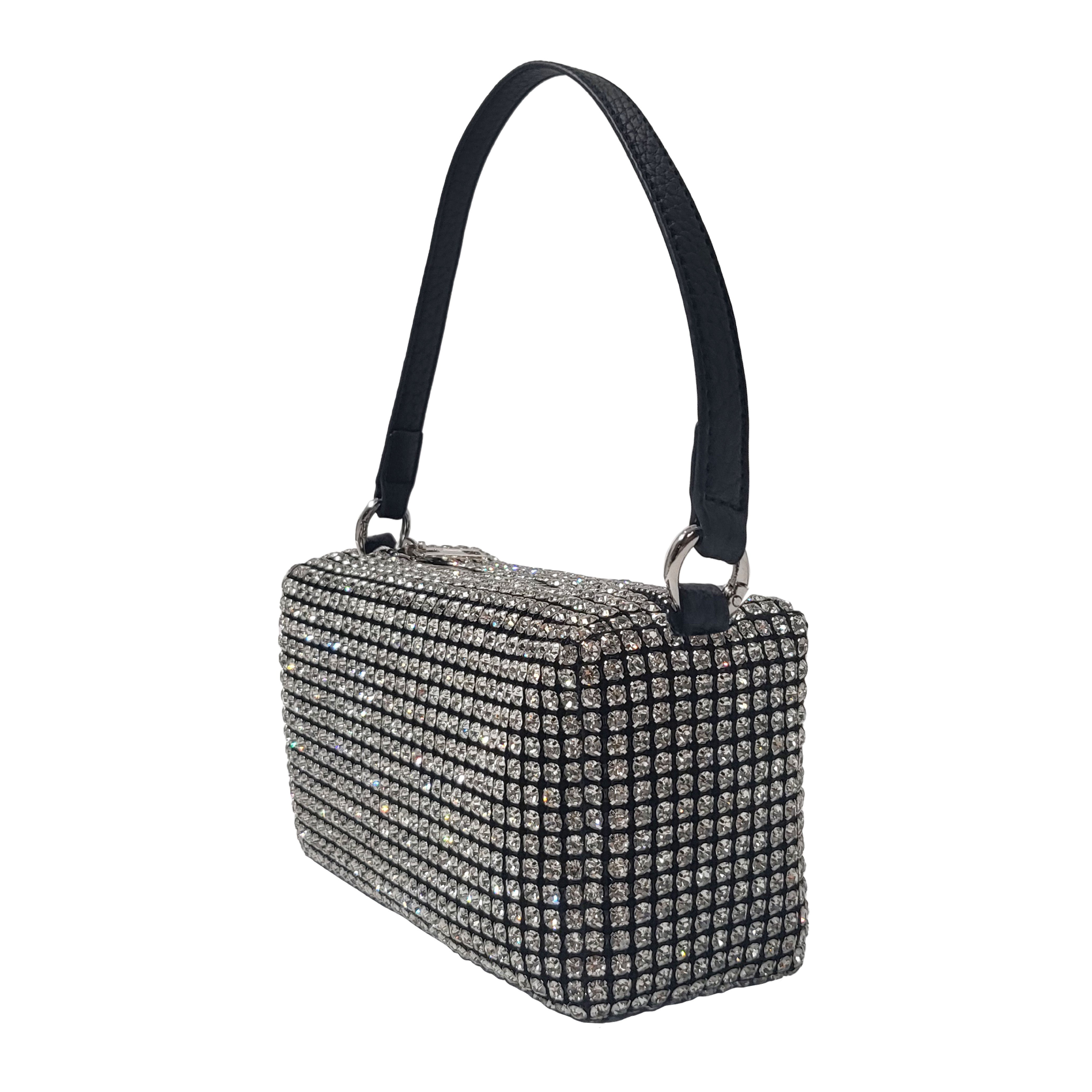 Add a touch of glamour to your evening look with our crystal-studded evening bag. Featuring a sleek vegan leather handle adorned with dazzling bling, this bag is the perfect accessory for making a sparkling statement