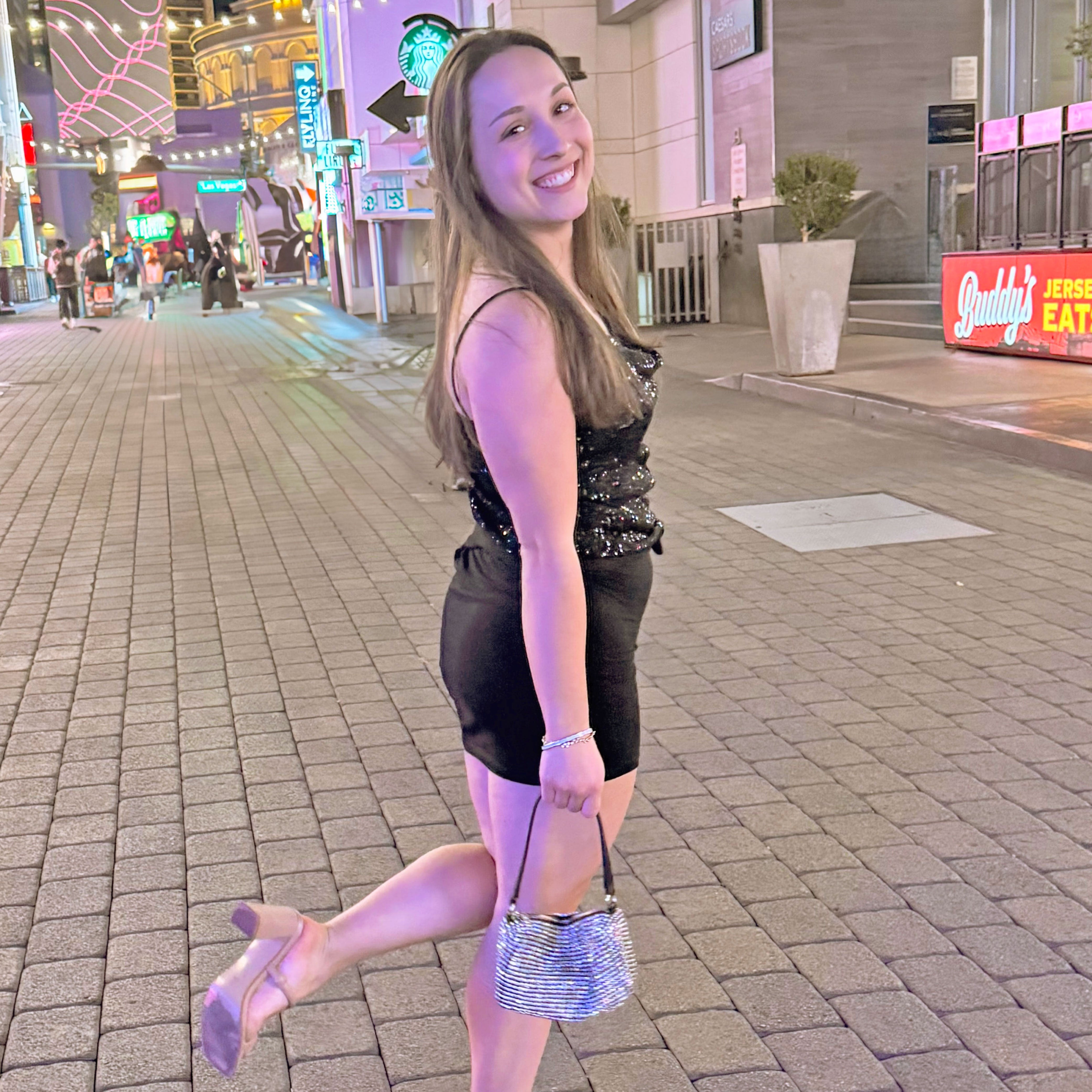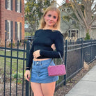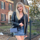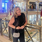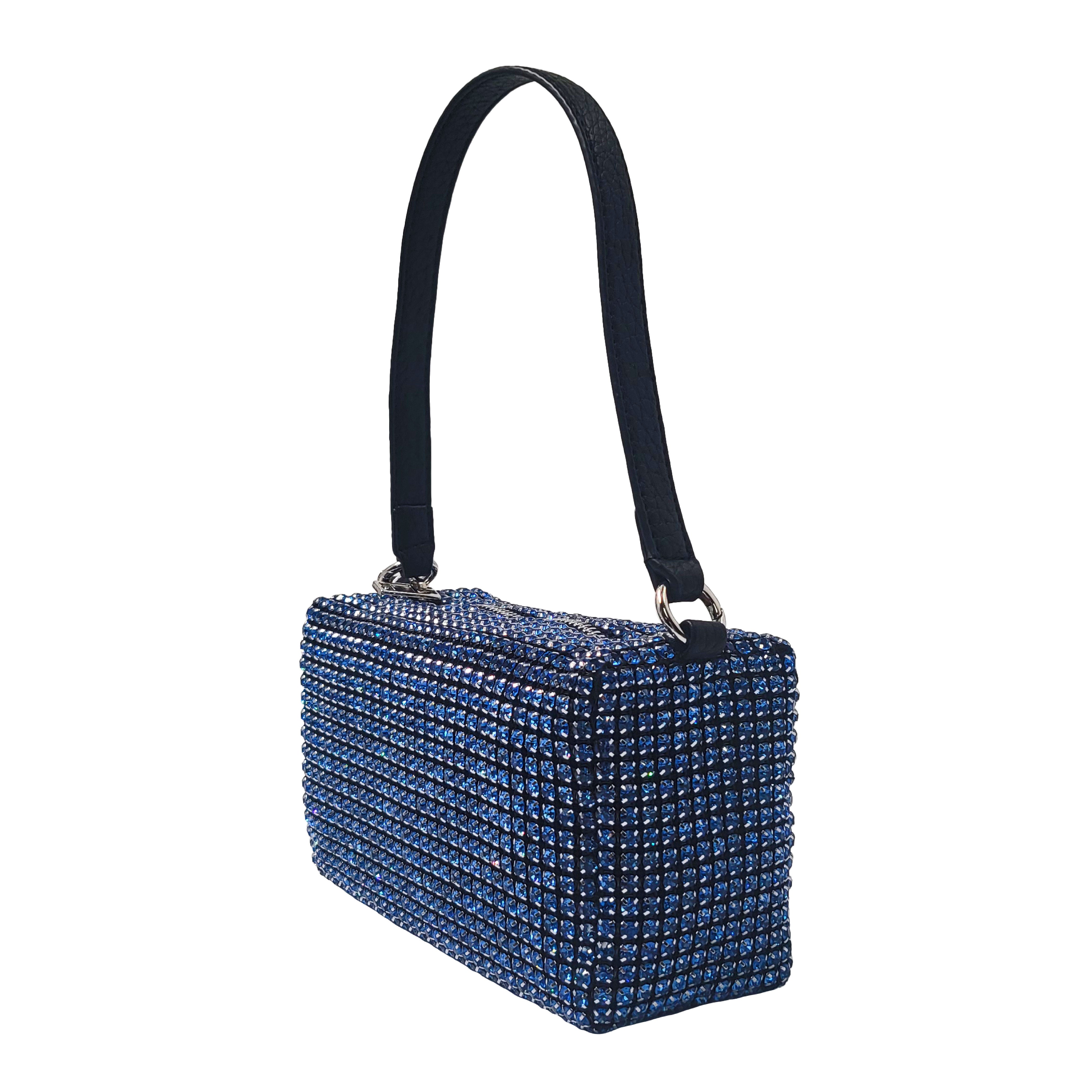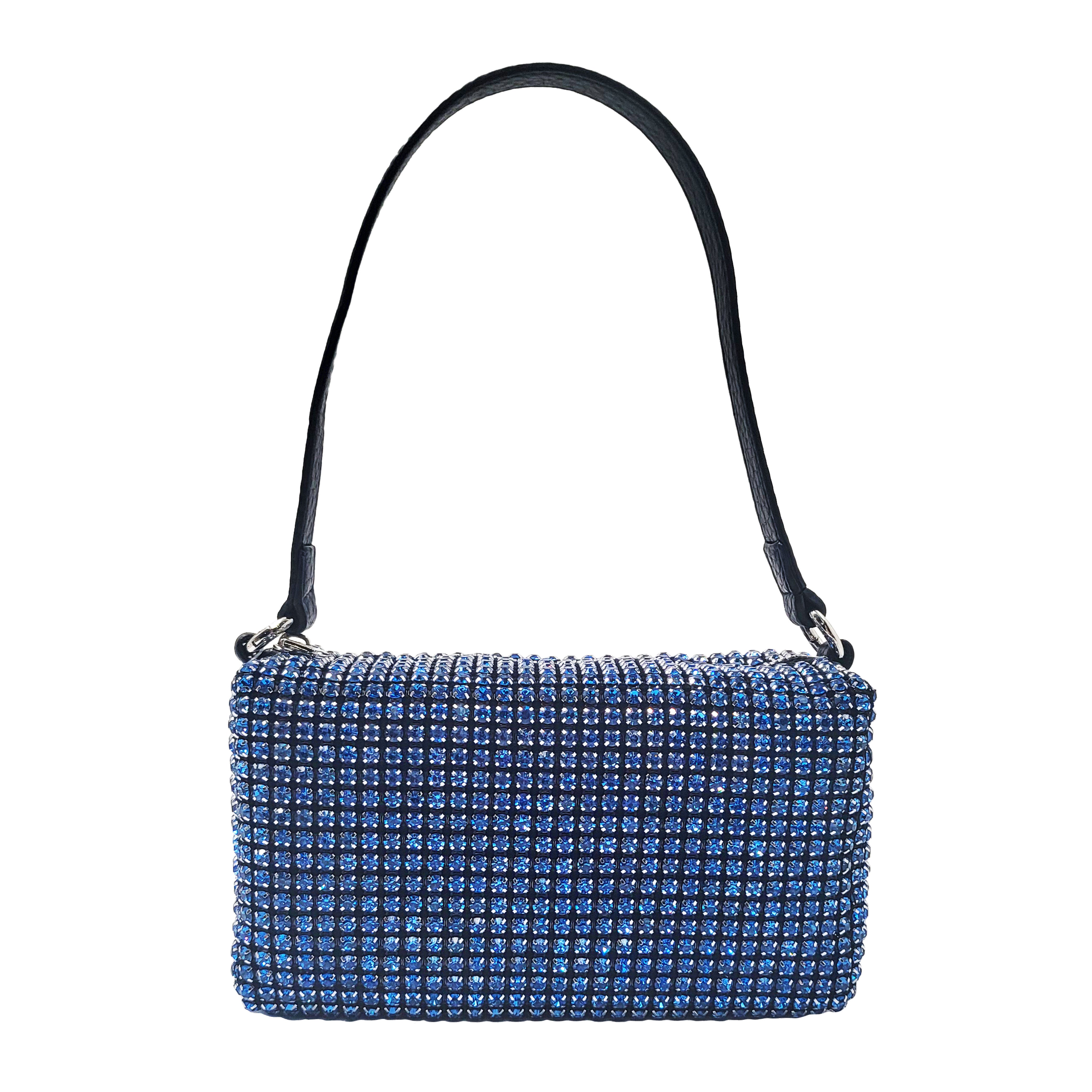Add a touch of glamour to your evening look with our crystal-studded evening bag. Featuring a sleek vegan leather handle adorned with dazzling bling, this bag is the perfect accessory for making a sparkling statement