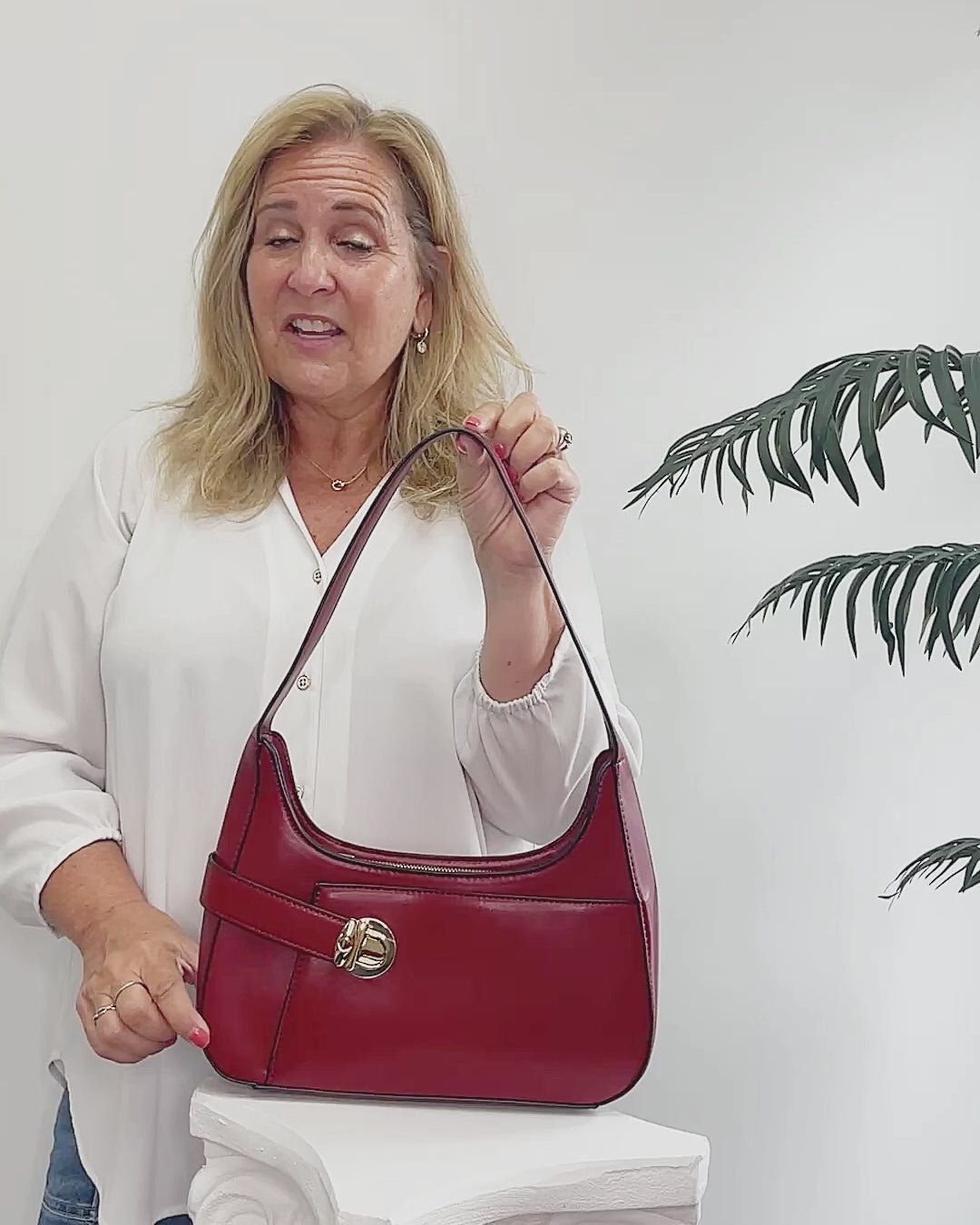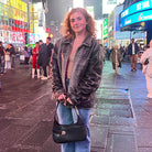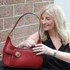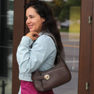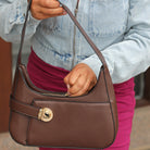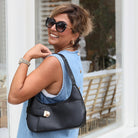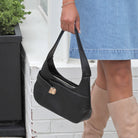 This structured hobo blends classic shape with modern details. A decorative buckle adds just the right touch of flair, while the top zipper keeps your essentials secure. The open front pocket offers grab-and-go convenience, and metal feet on the bottom protect the base in style.