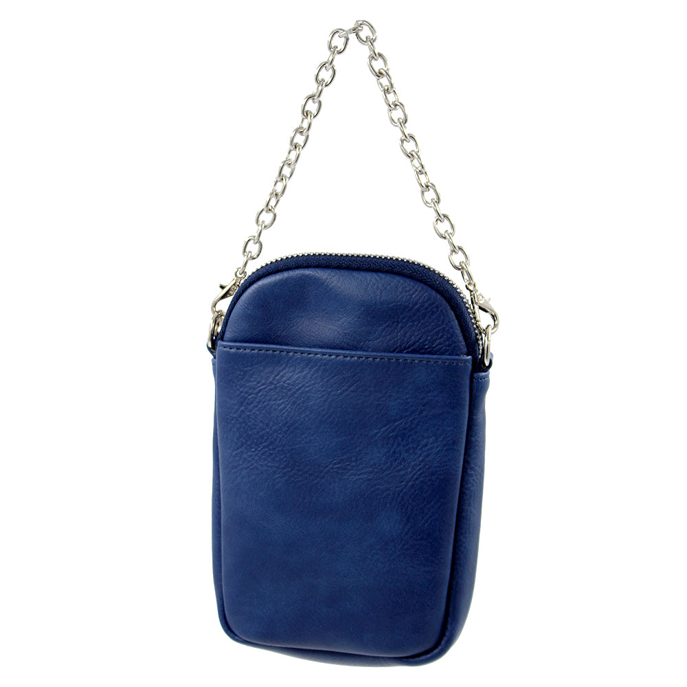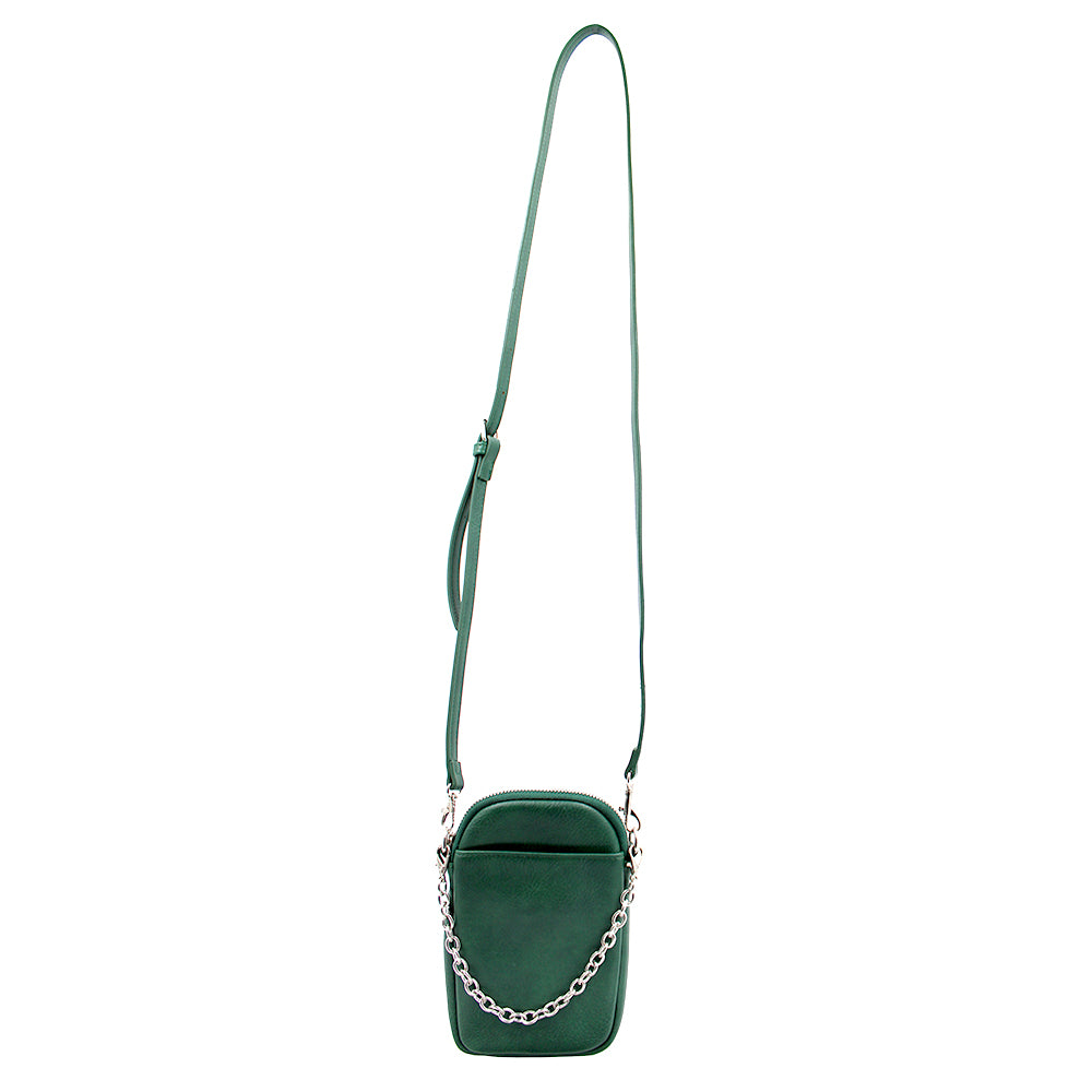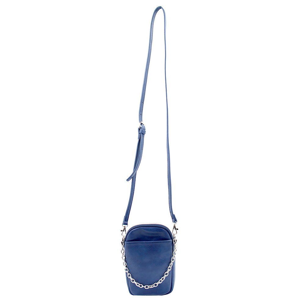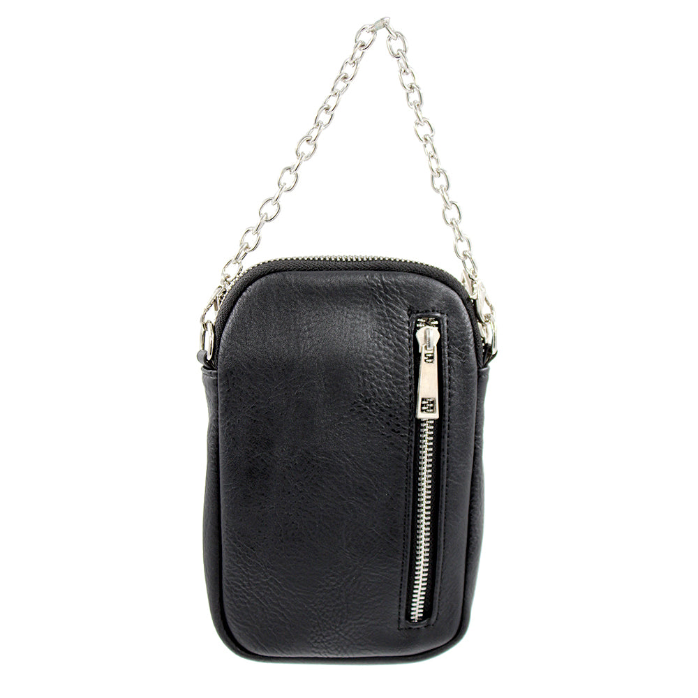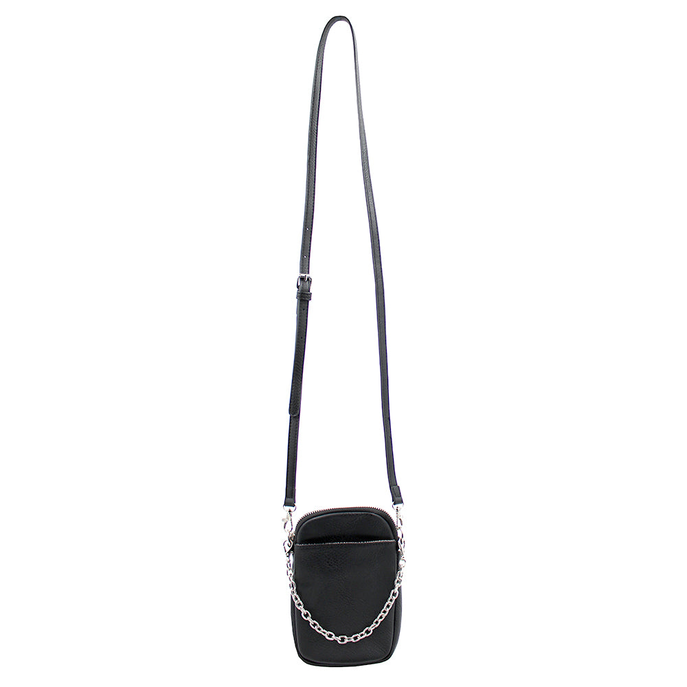 Long adjustable crossbody and short chain strap. Front open pocket and zipper back pocket. 2 RFID-protected card sleeves built-in. vegan leather.