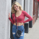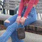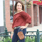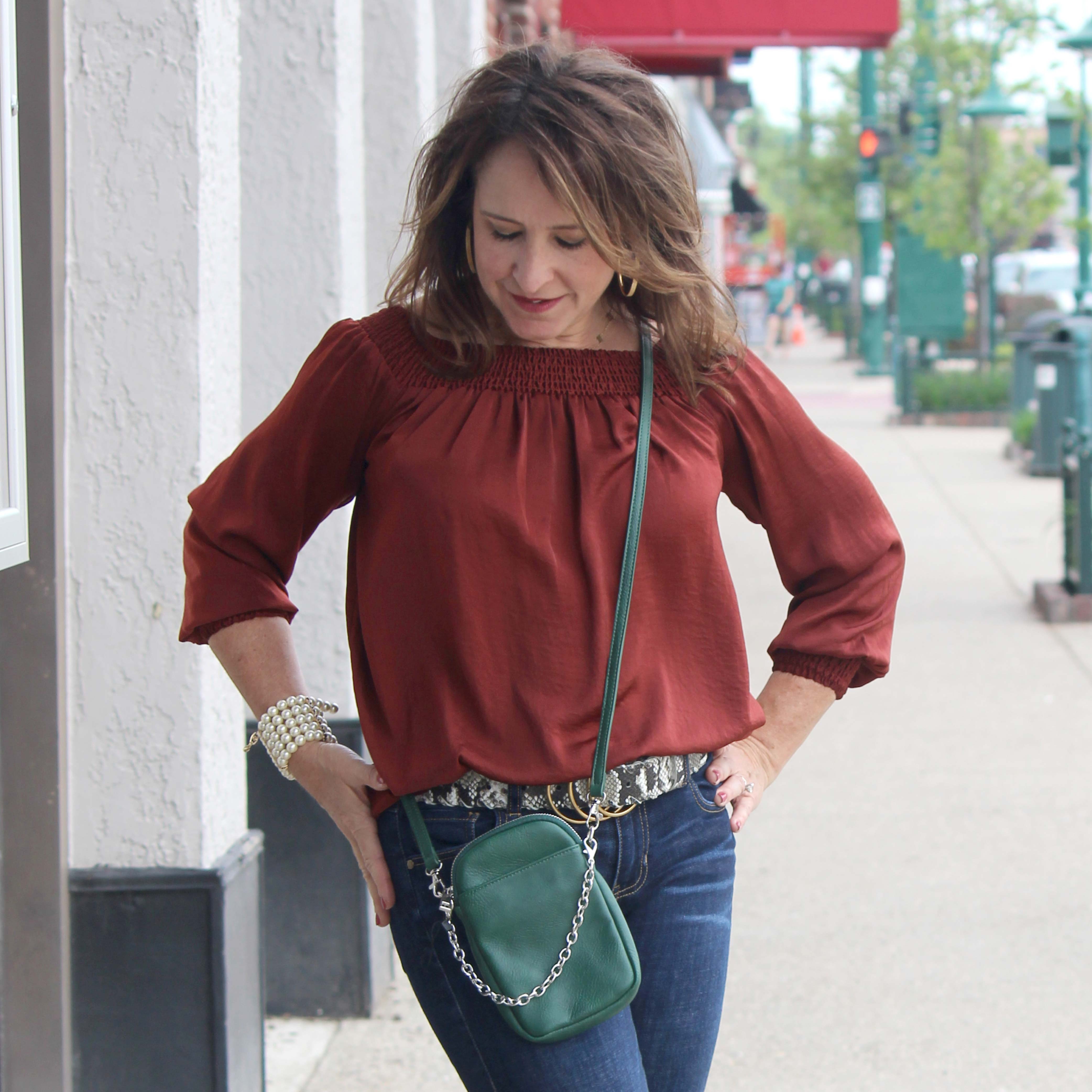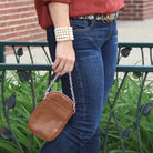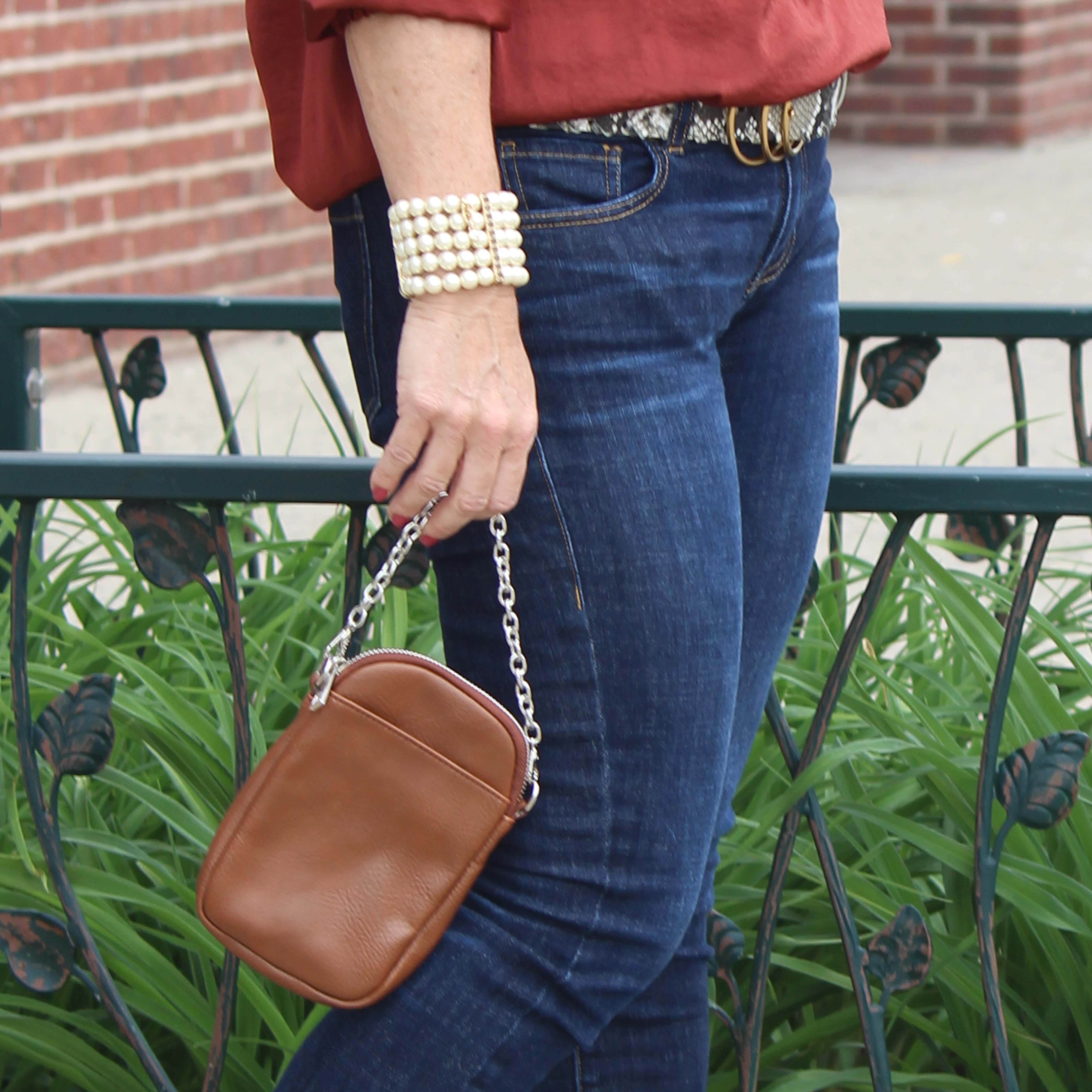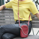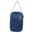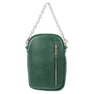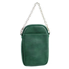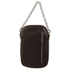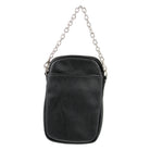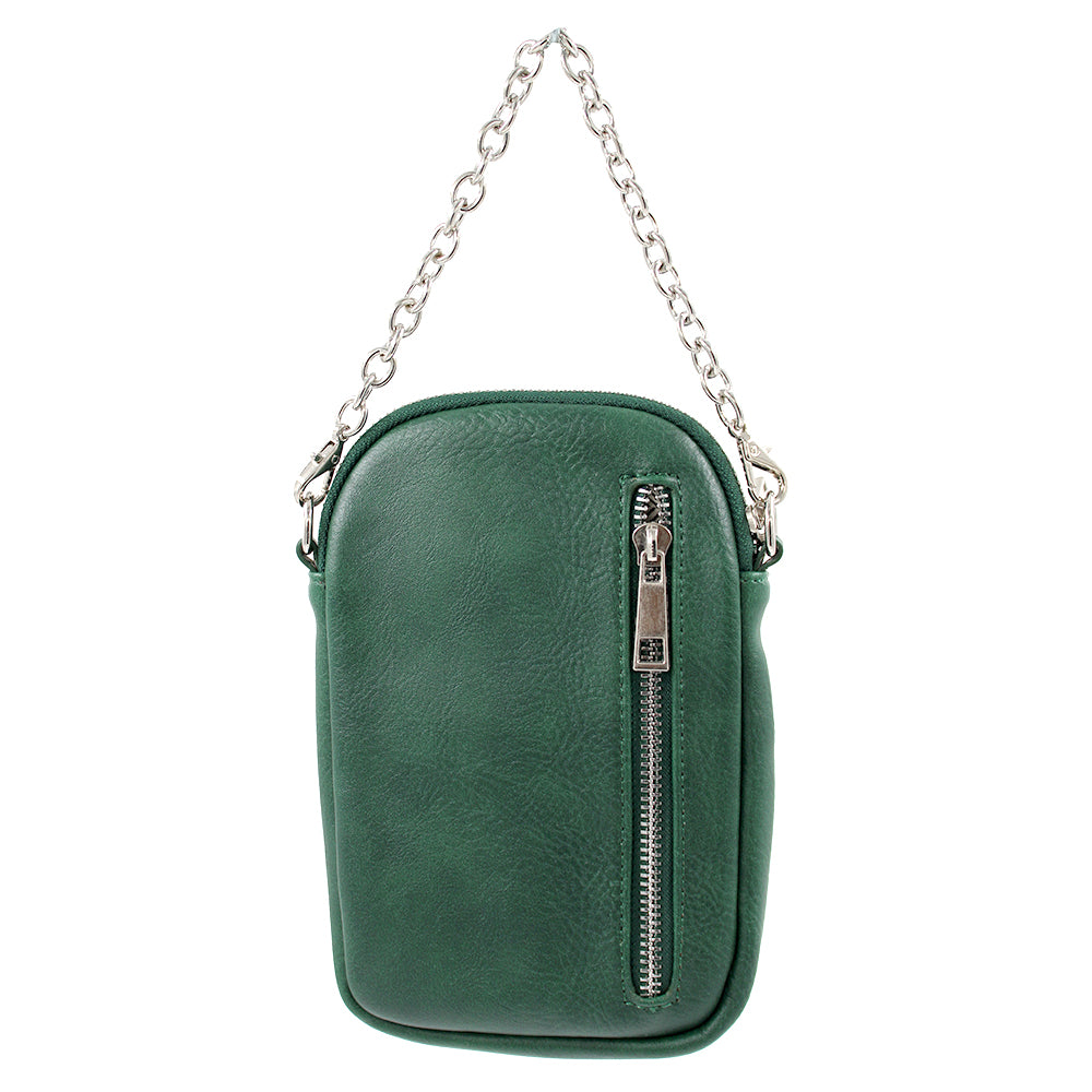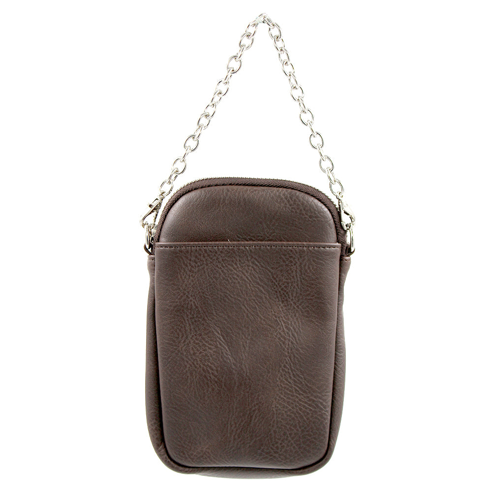 Long adjustable crossbody and short chain strap. Front open pocket and zipper back pocket. 2 RFID-protected card sleeves built-in. vegan leather.