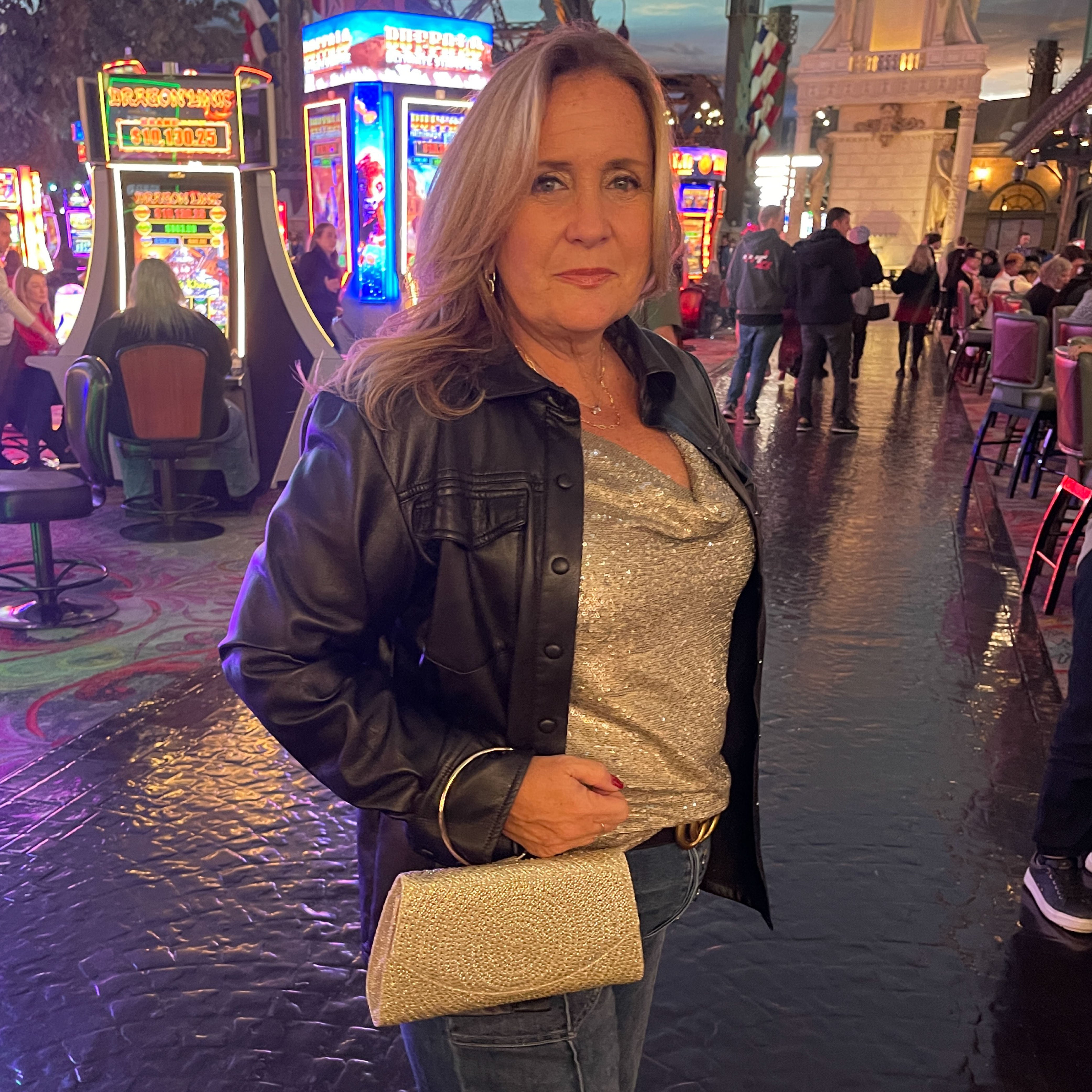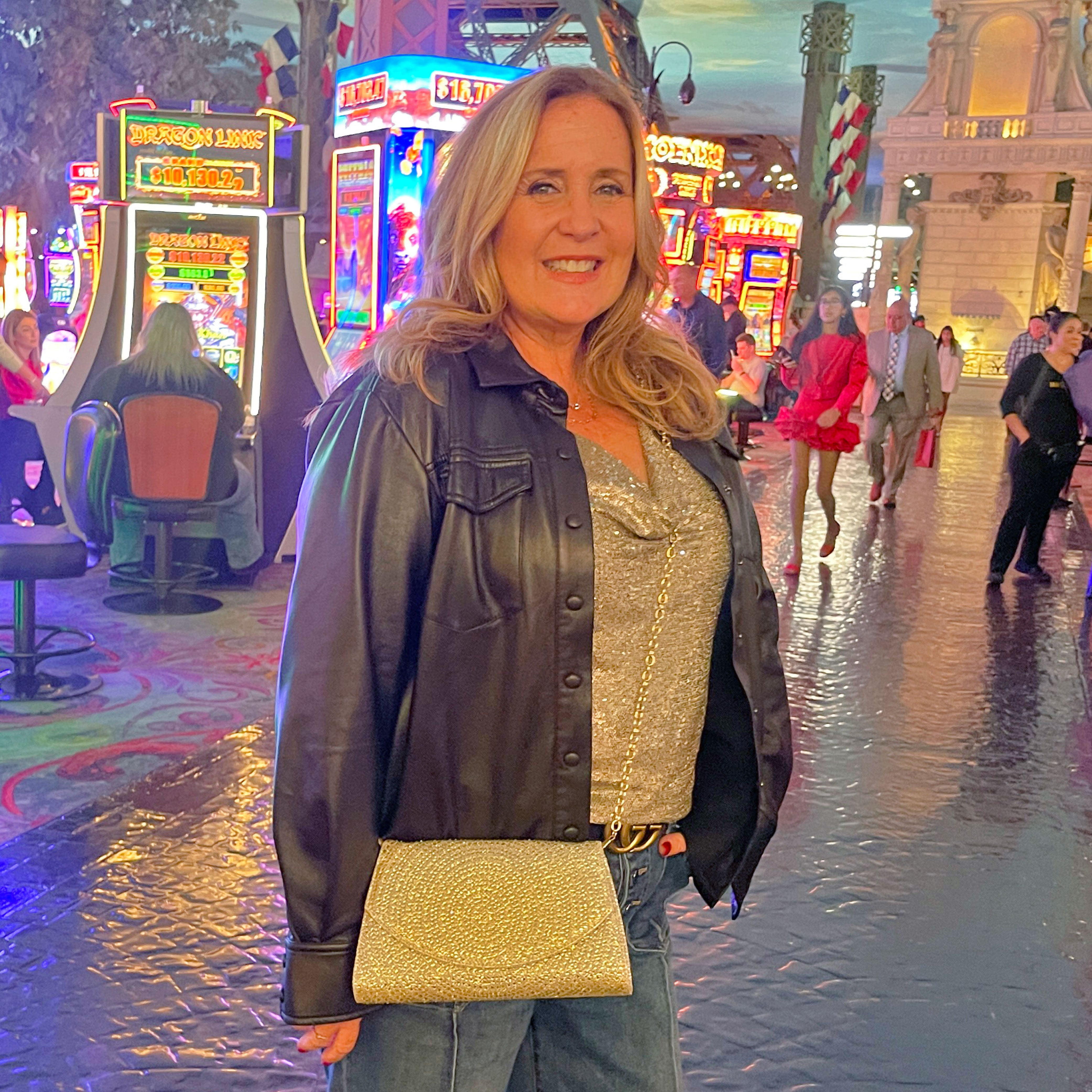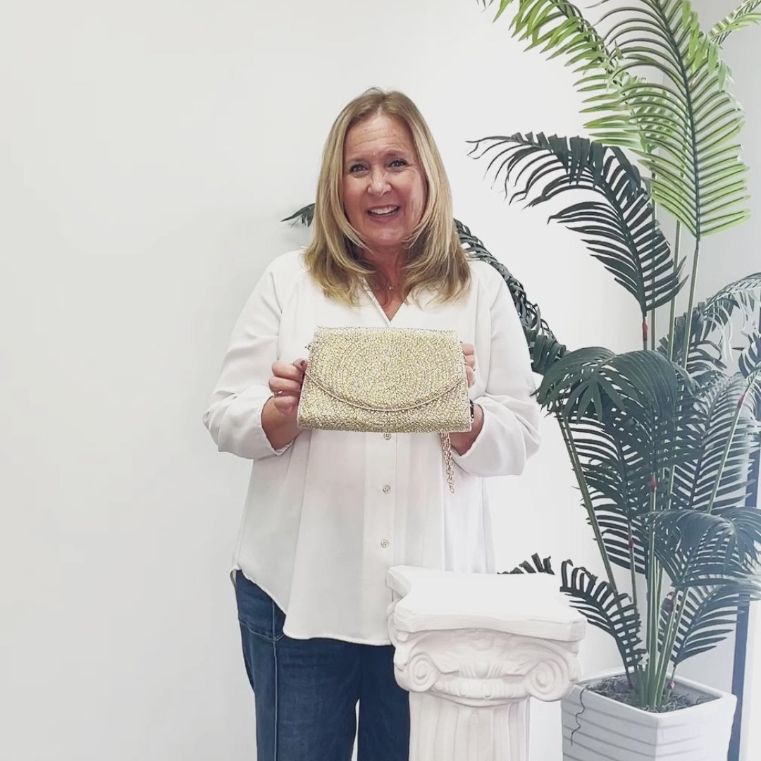 Elevate your style with this versatile evening bag, designed to be carried three ways: as a crossbody with a chic gold link chain, a wristlet with a bold gold ring, or a sleek clutch. Adorned with dazzling gold sparkle crystals, it’s the perfect blend of elegance and function. Inside, you’ll find RFID-protected card sleeves, so you can leave the bulky wallet at home and carry your essentials with ease.