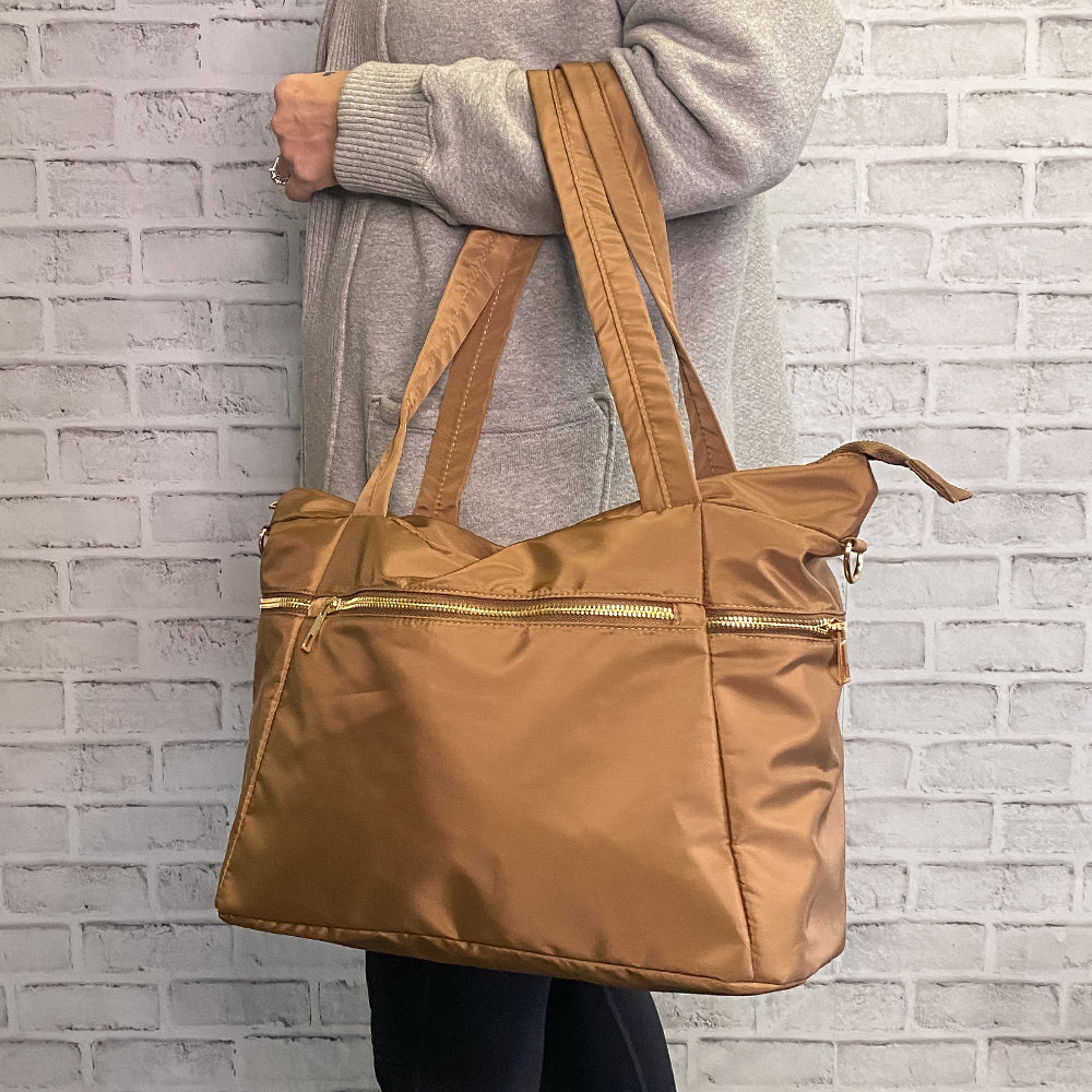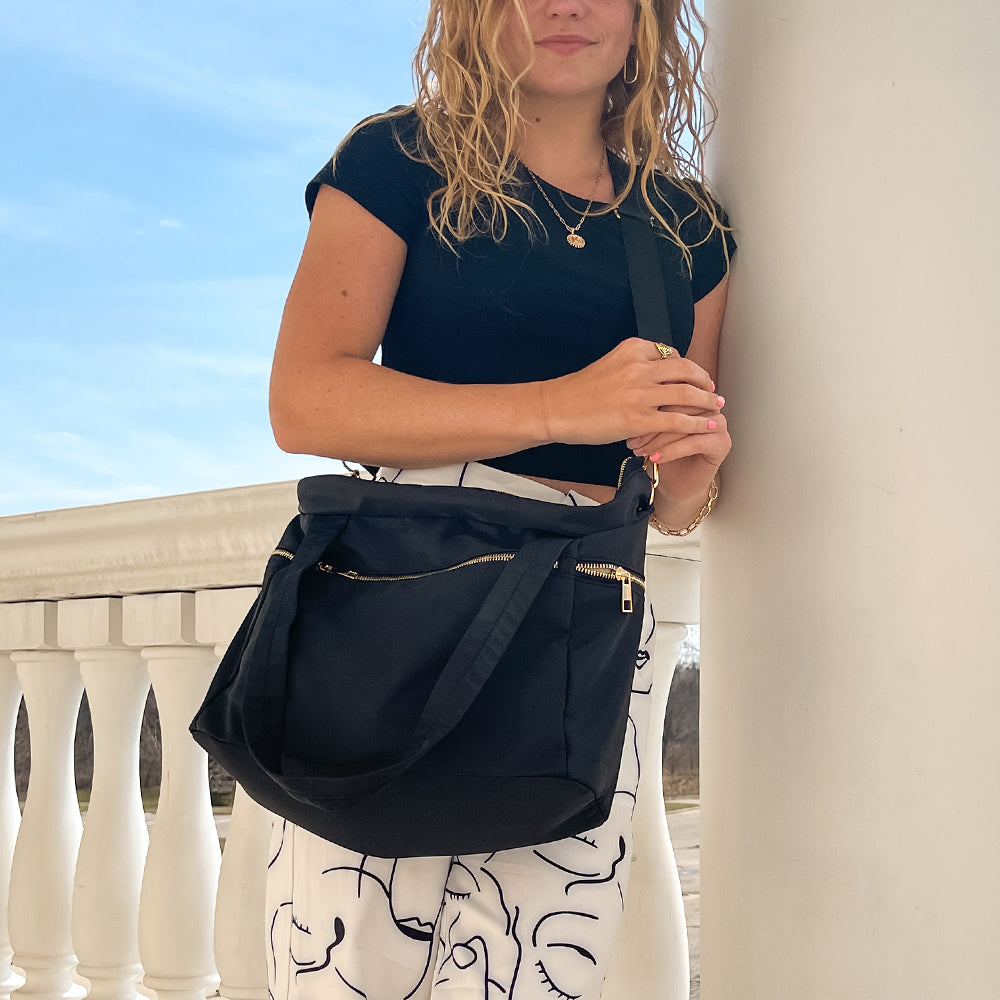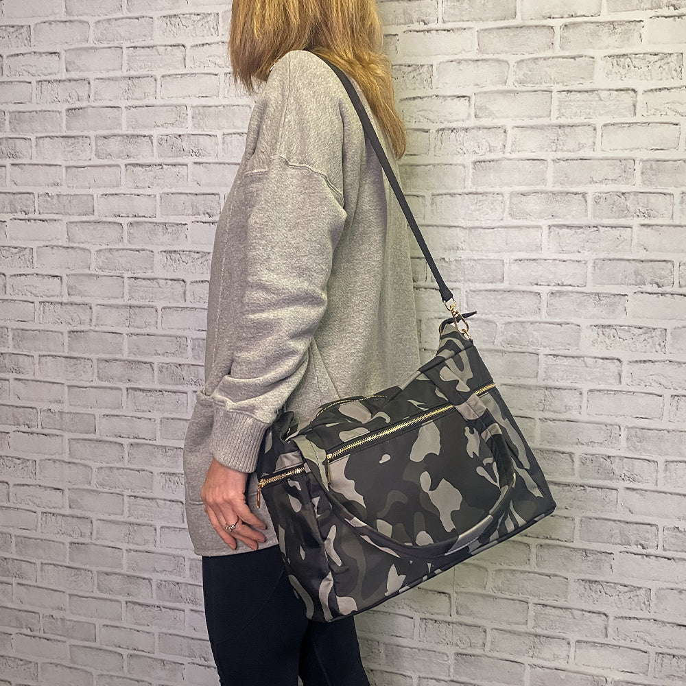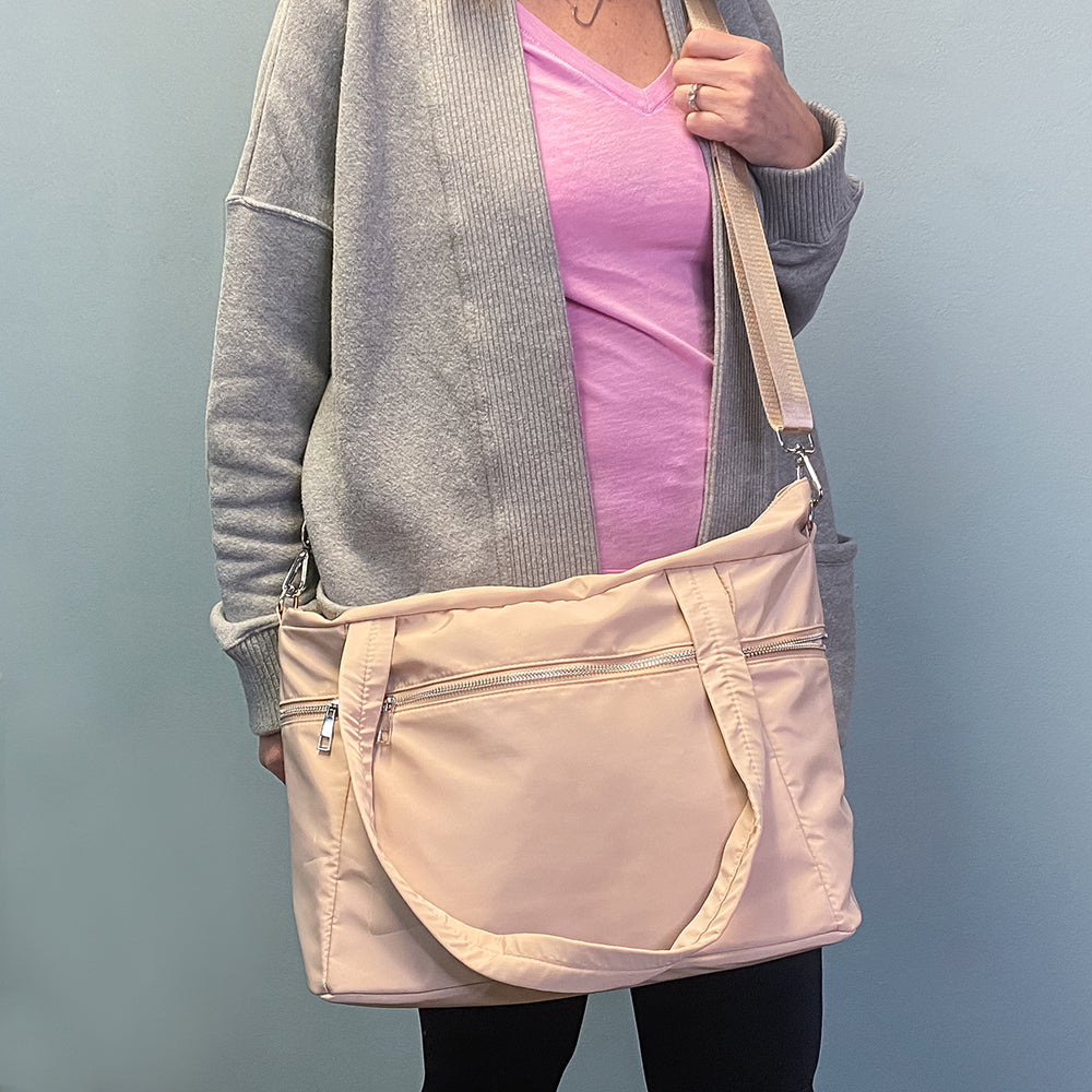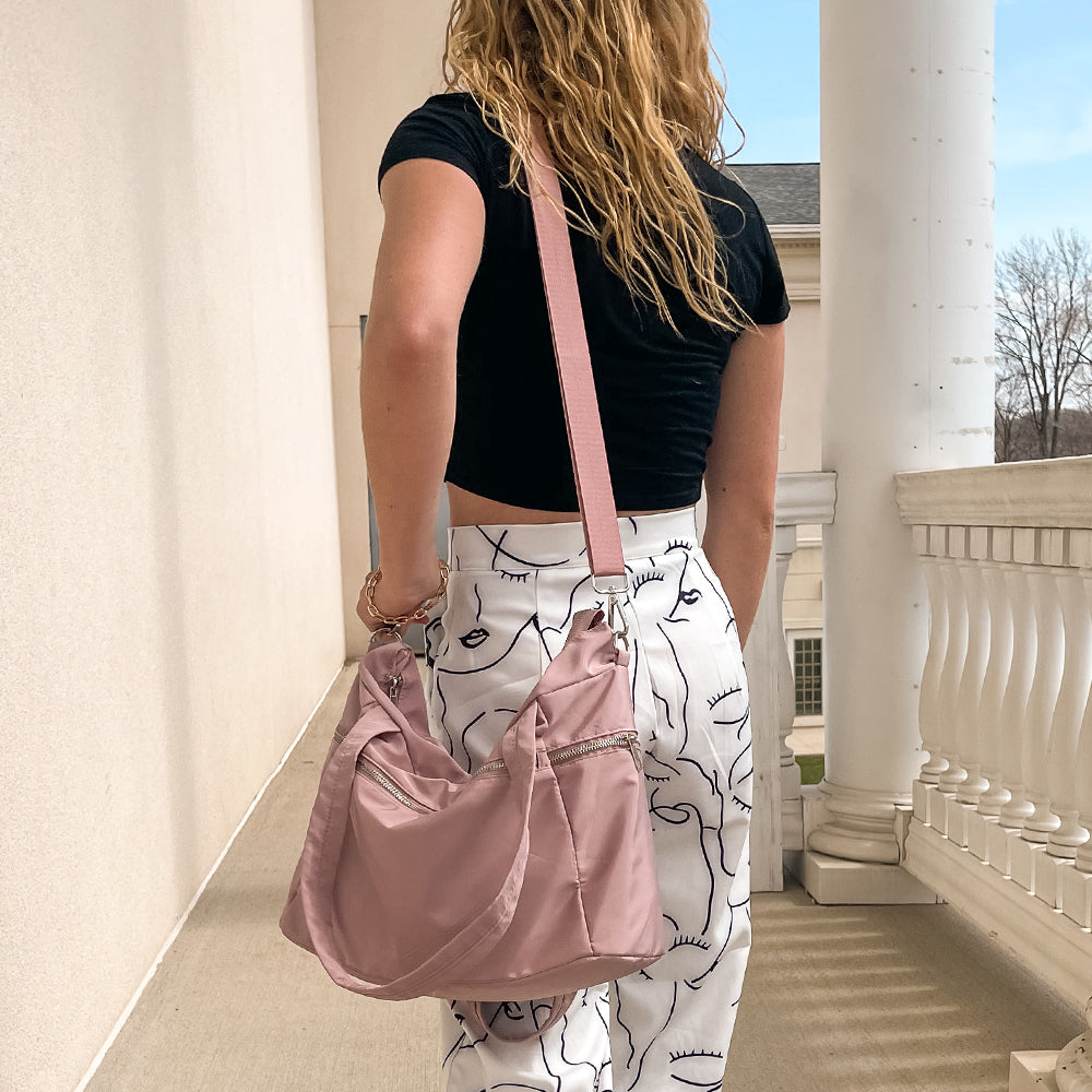 Detachable crossbody strap included, RFID-protected card sleeves built in, front and side zipper pockets.