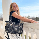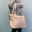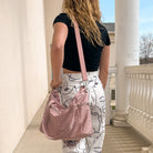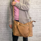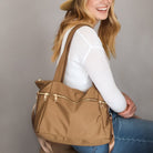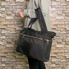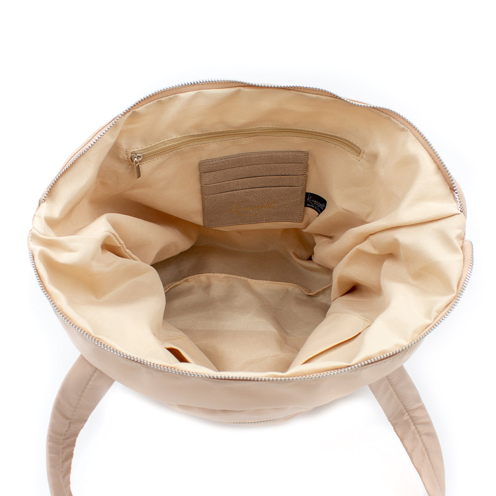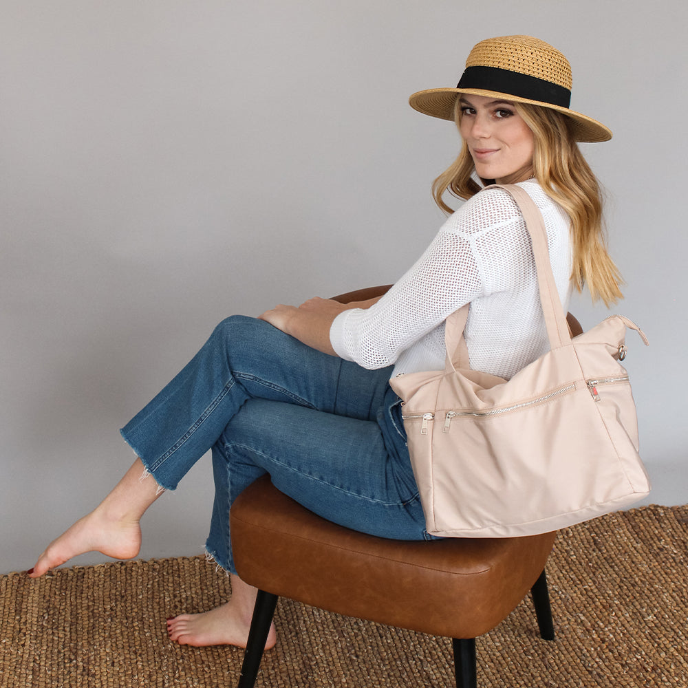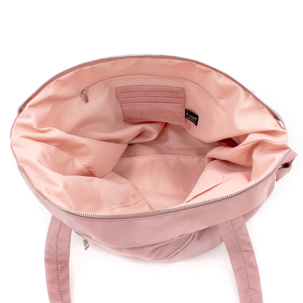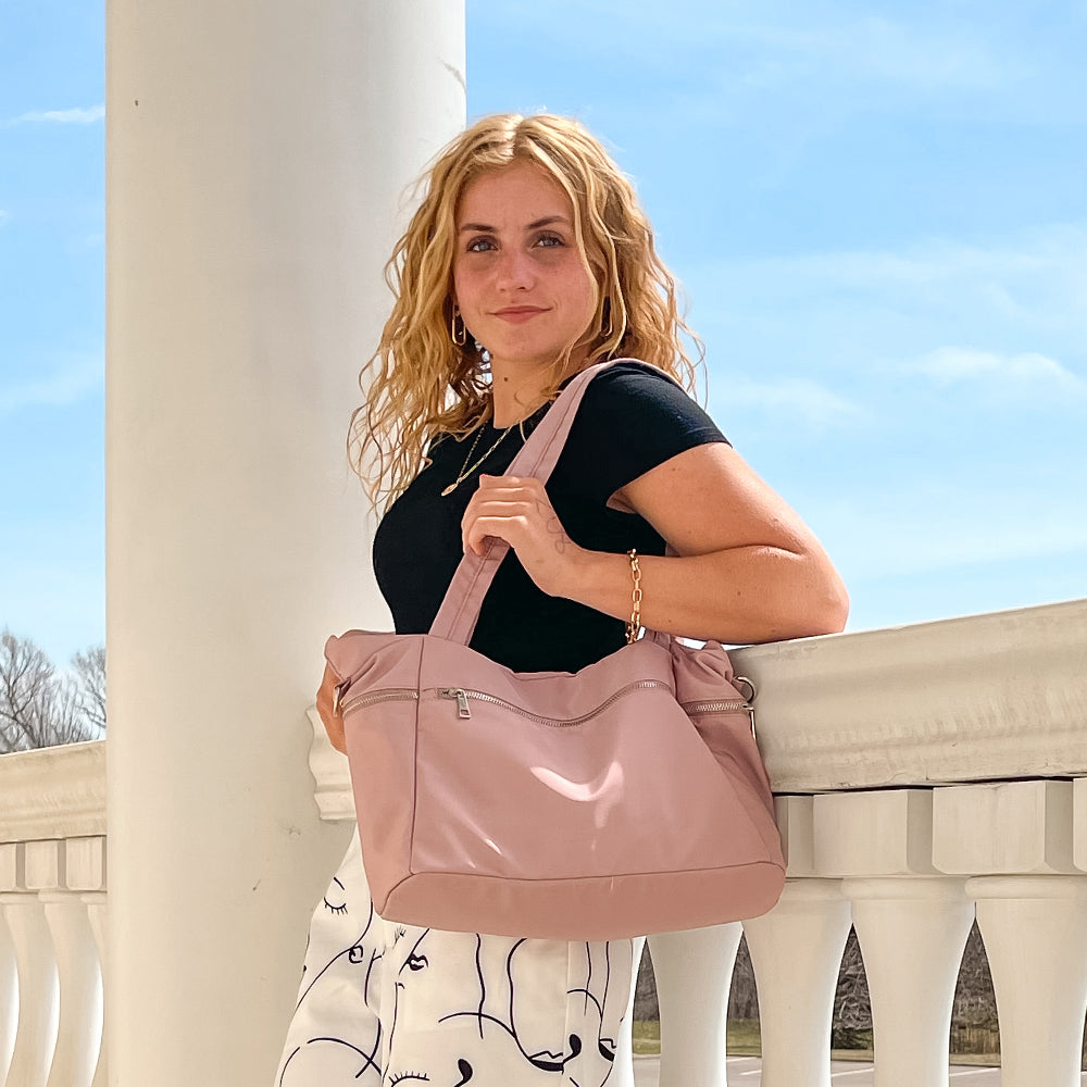 Detachable crossbody strap included, RFID-protected card sleeves built in, front and side zipper pockets.