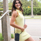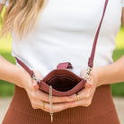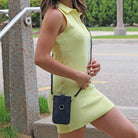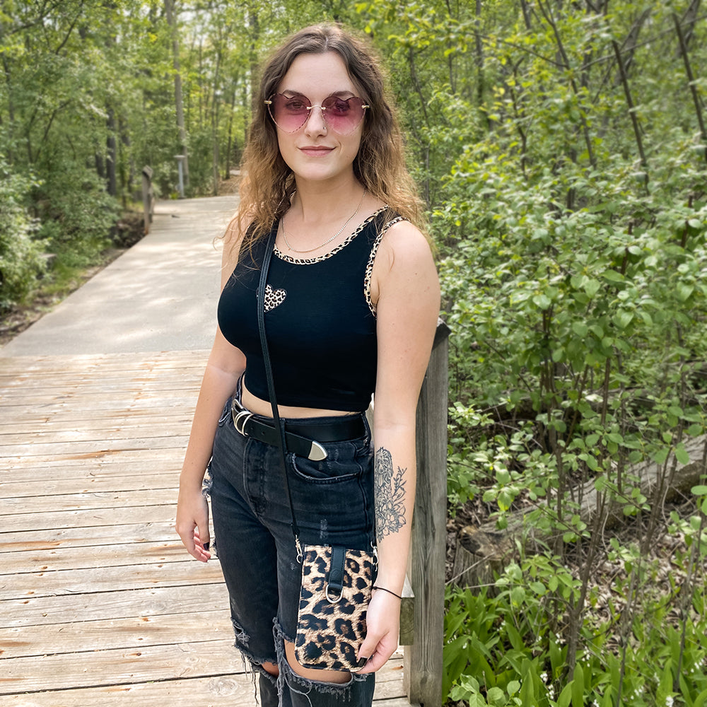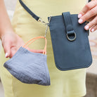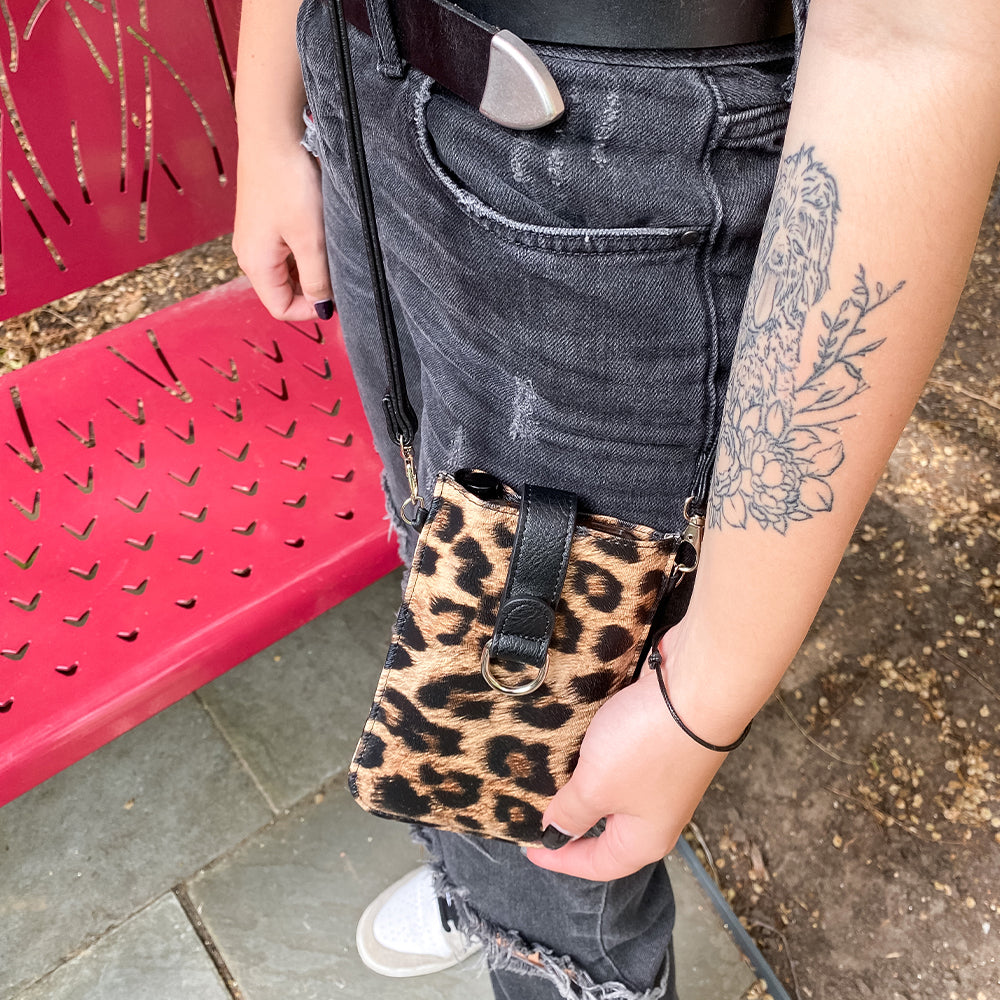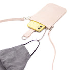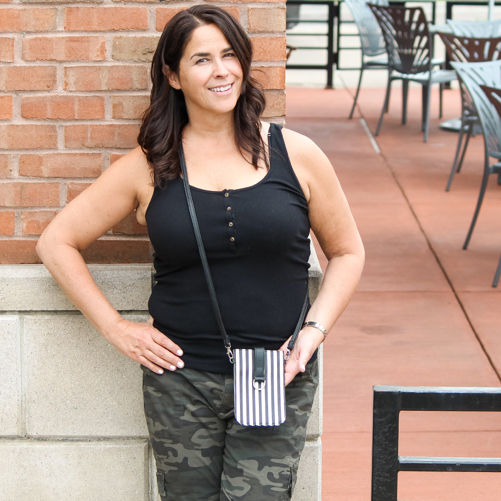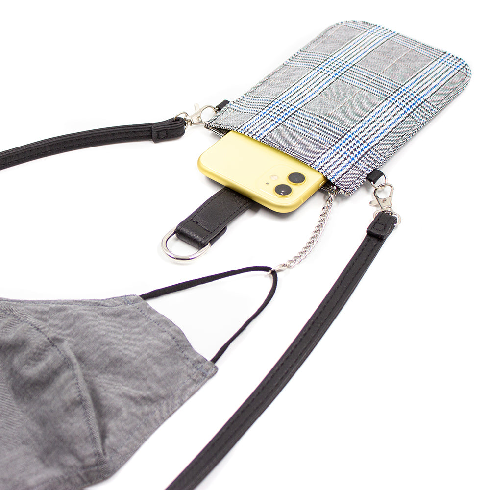 Our Pouch Purse is a perfect hands-free crossbody! Slip your phone in and secure with the magnet strap (fits most phones with case); also includes RFID-protected built-in card slots, a chain and clip for your keys or mask, and a detachable crossbody strap.