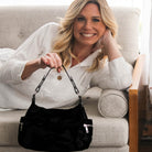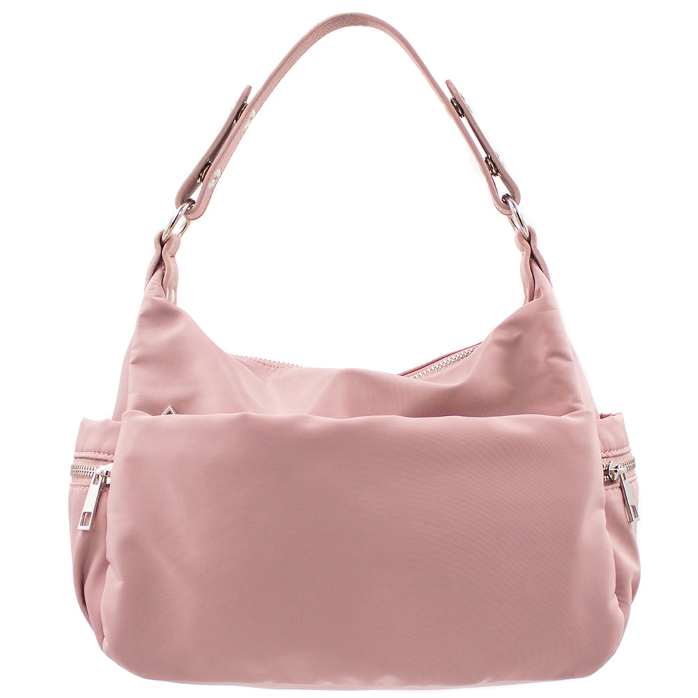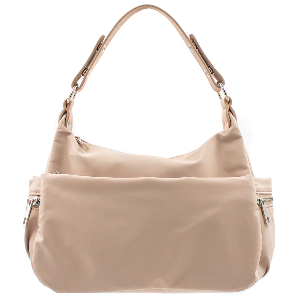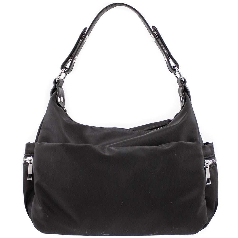 Lightweight nylon material, RFID-protected card sleeves built in, metal zippers for organization, detachable crossbody strap.