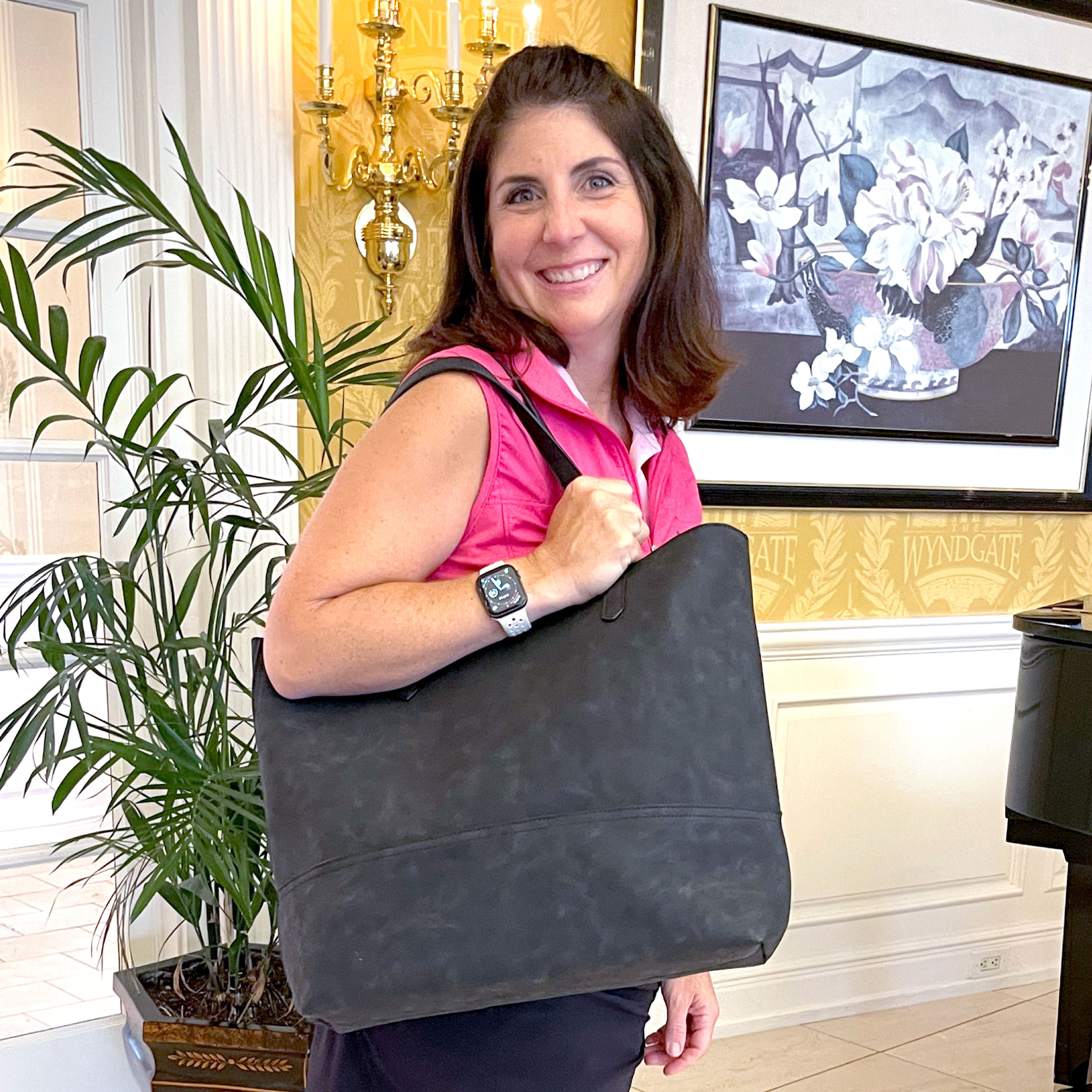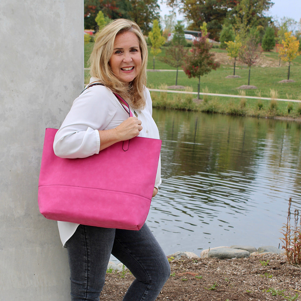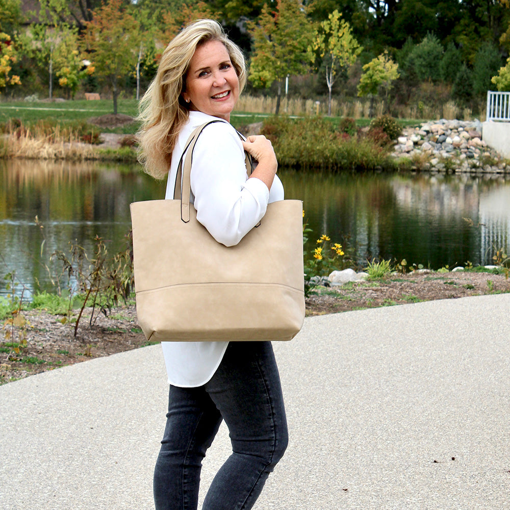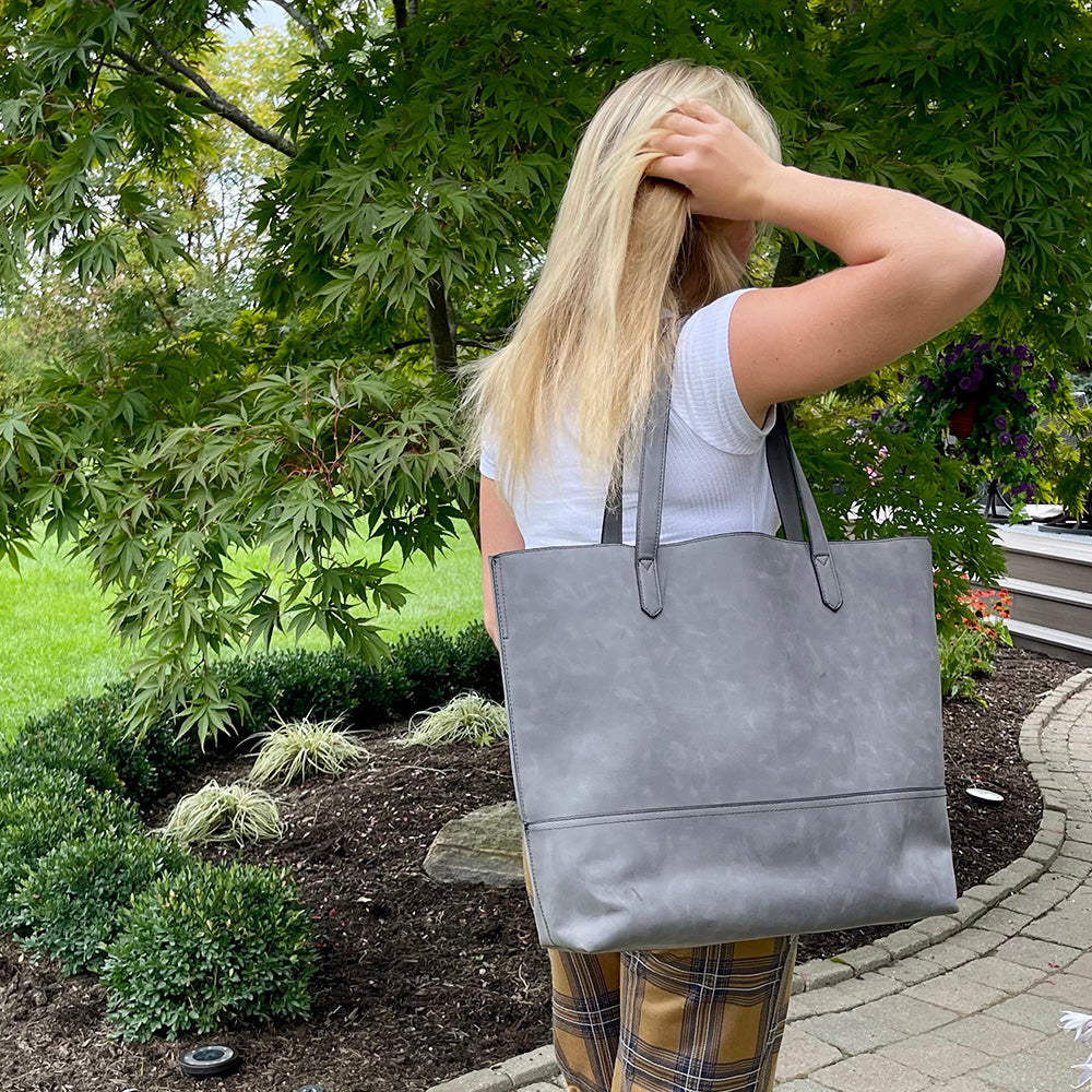Our Taylor Tote, oversized and designed with faux suede, is honoring our founder’s daughter, Madison, on her recent wedding and her new last name, Mrs. Madison Carroll Taylor! Oversized open tote for carrying all your extras! It’s simple versatility makes this tote both fashionable and functional. Great to use for everyday with your laptop, to the beach, football games on Friday night or to the gym!