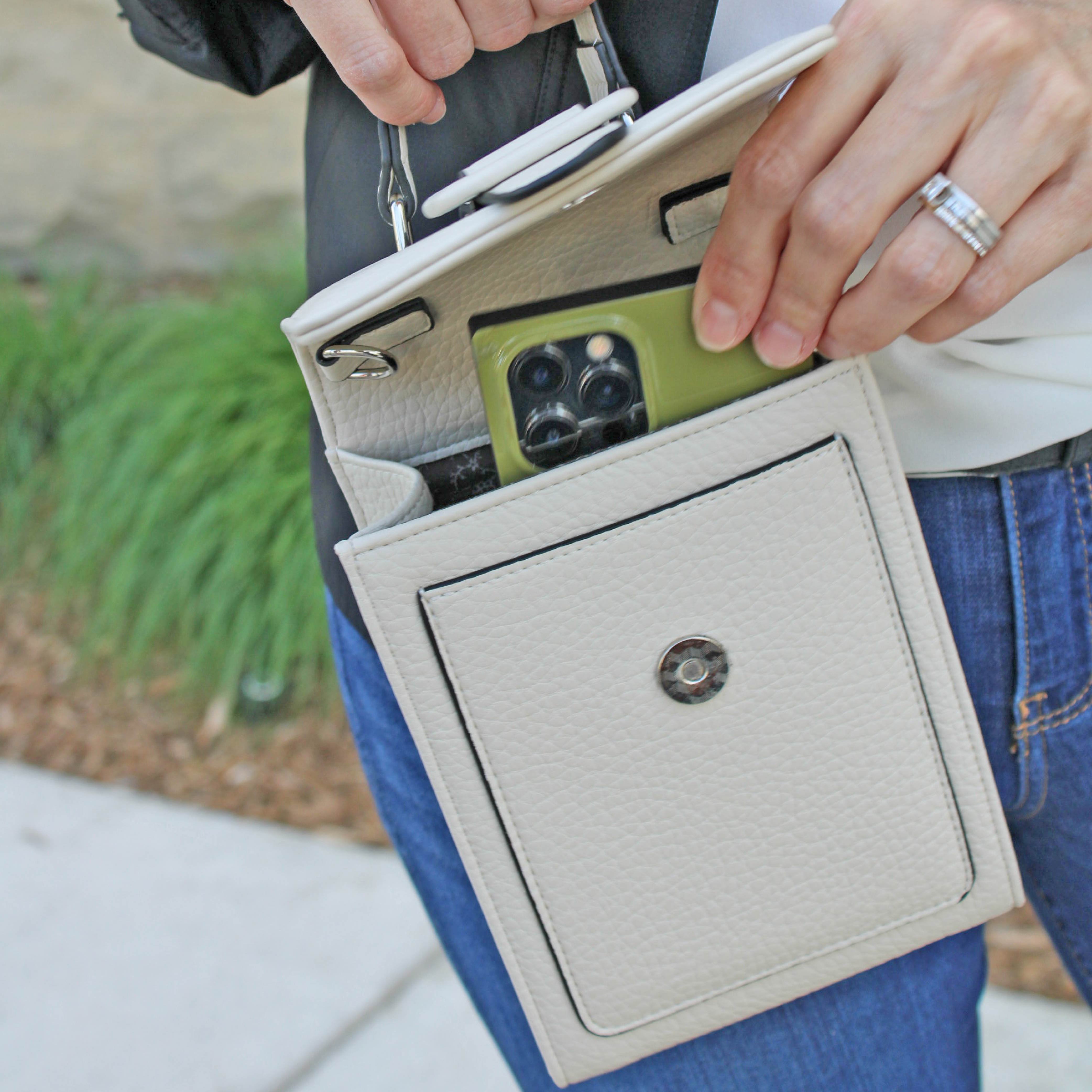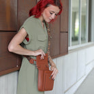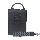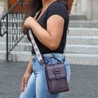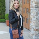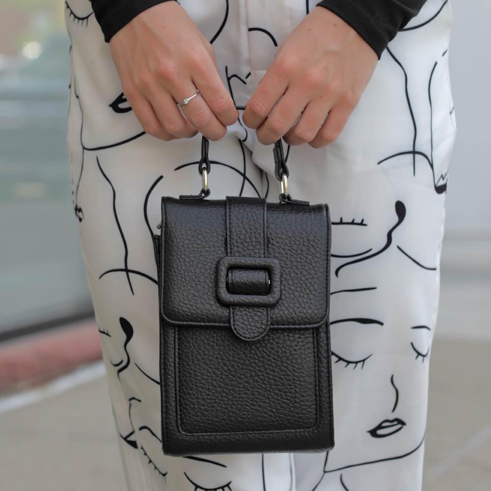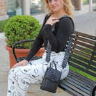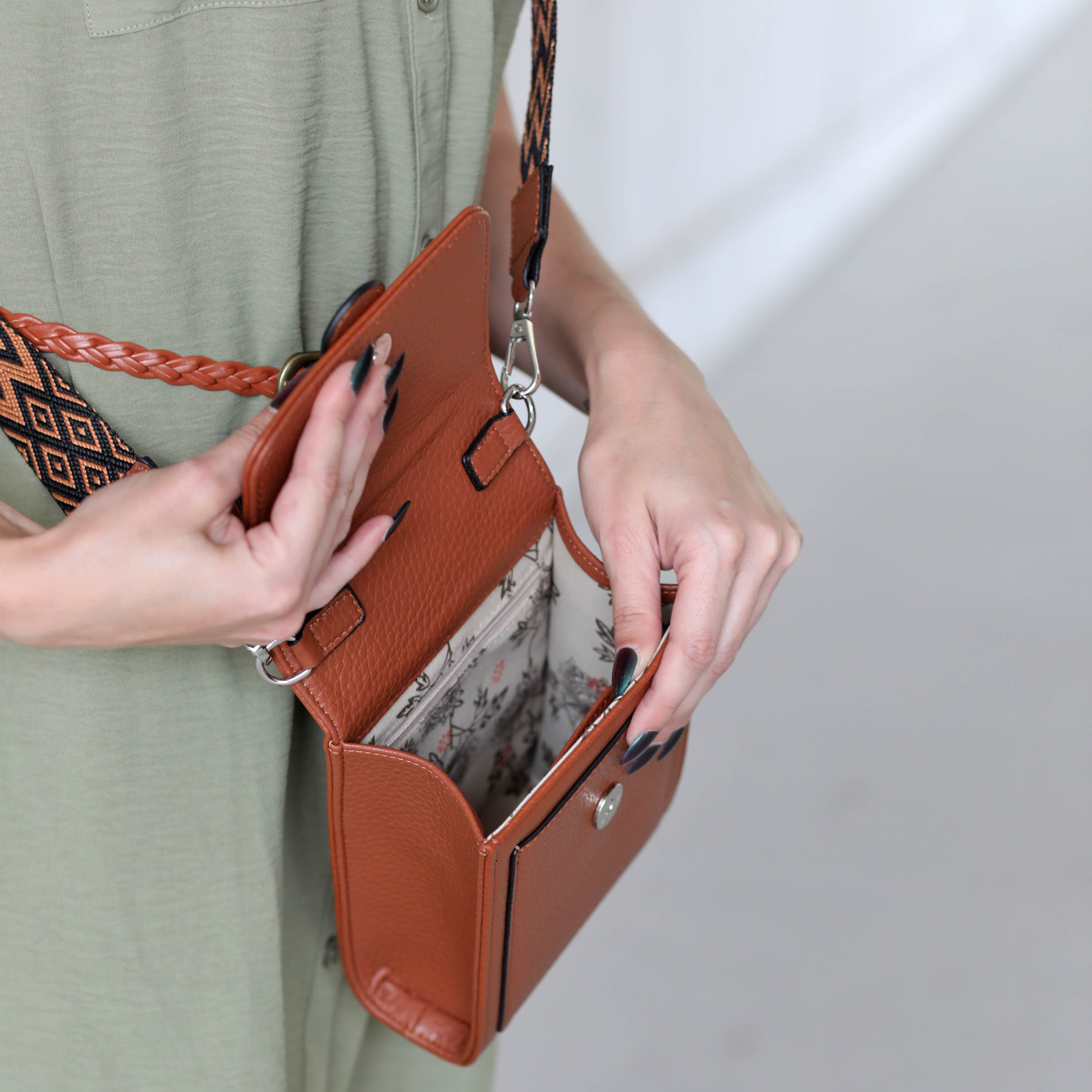 Introducing our newest crossbody, she’s large enough to fit all you need but still small and compact. With a 2 inch depth, there is room inside. Wear as a satchel or attach the coordinating guitar strap for a fun, hands-free look. On the outside back, an open pocket for phone convenience. Closes with a magnet snap, on the front you will find an open pocket. Inside is a zipper pocket and 3 RFID protected card sleeves built in.