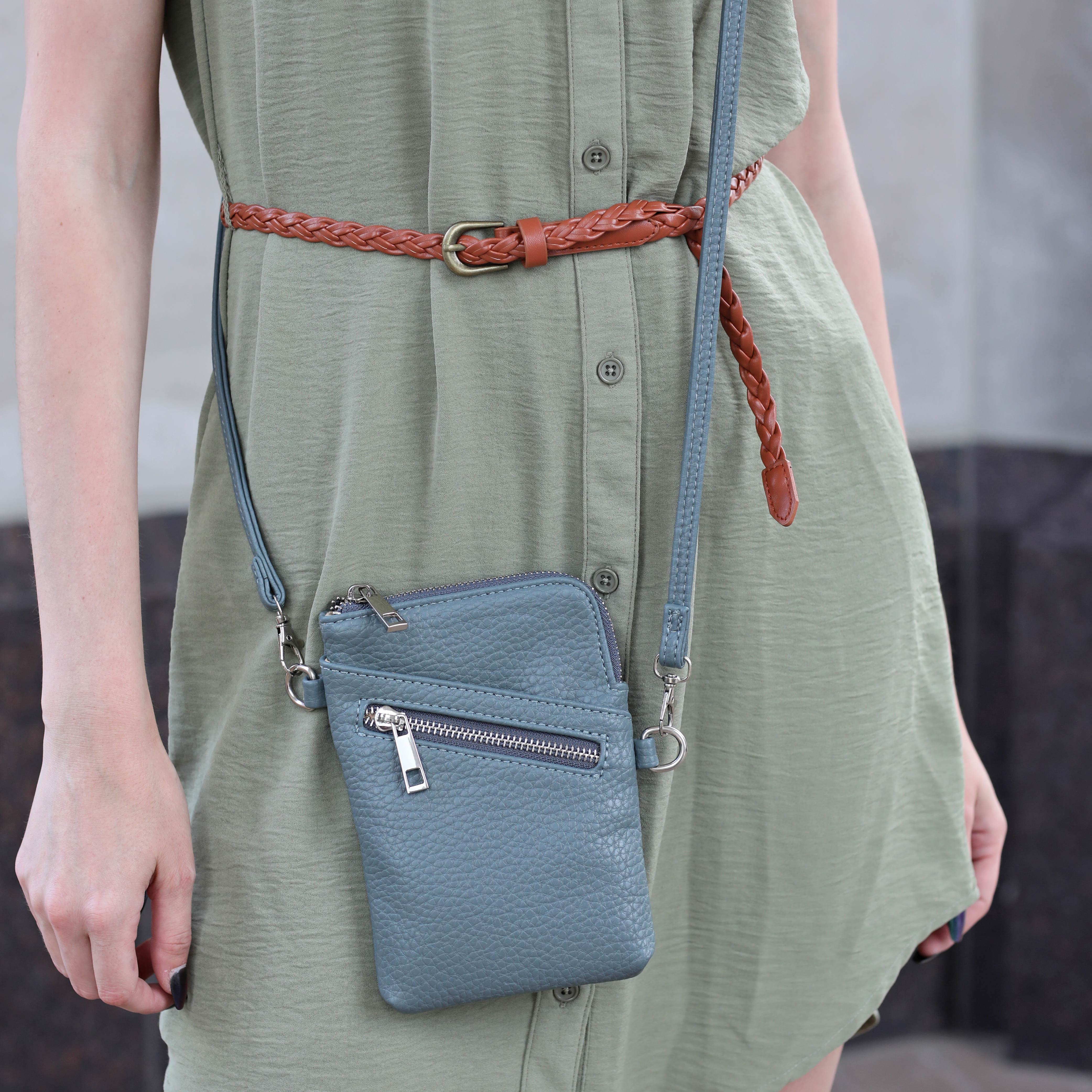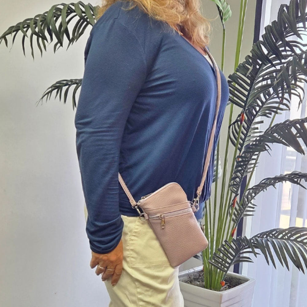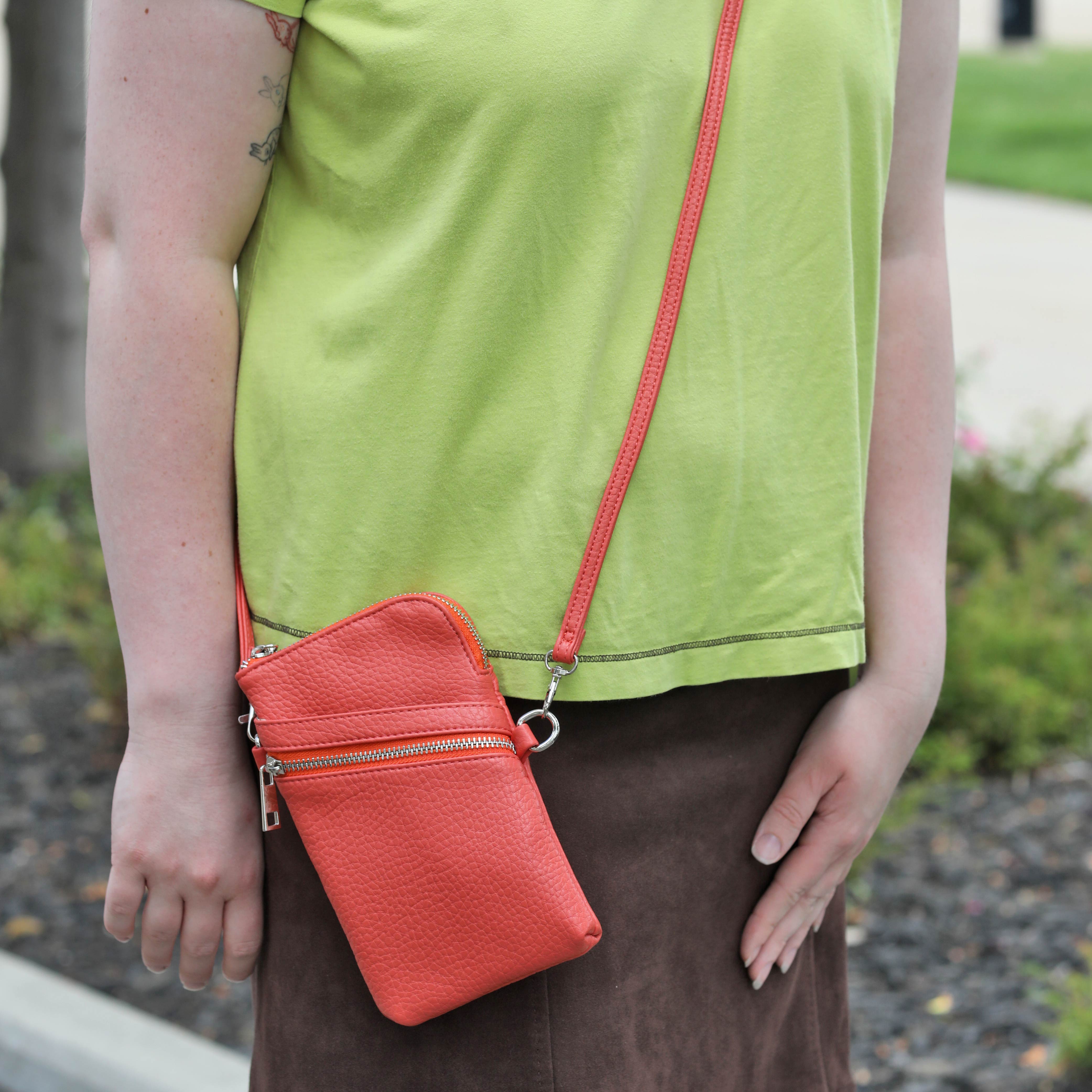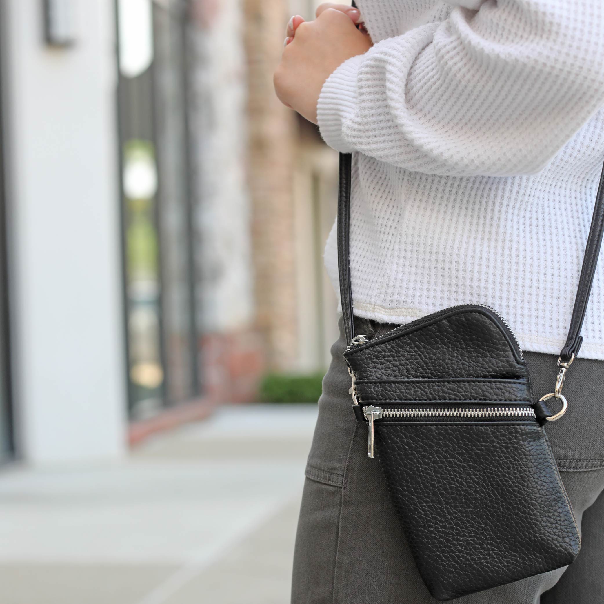 We do crossbody bags best and this new one is perfect! Metal zippers accent a grain vegan leather. Front zipper pocket can store a small card sleeve. Behind that, is an open pocket, large enough for most phones inside a case. The top zipper wraps around the side, giving you a wide opening to access your belongings easily.