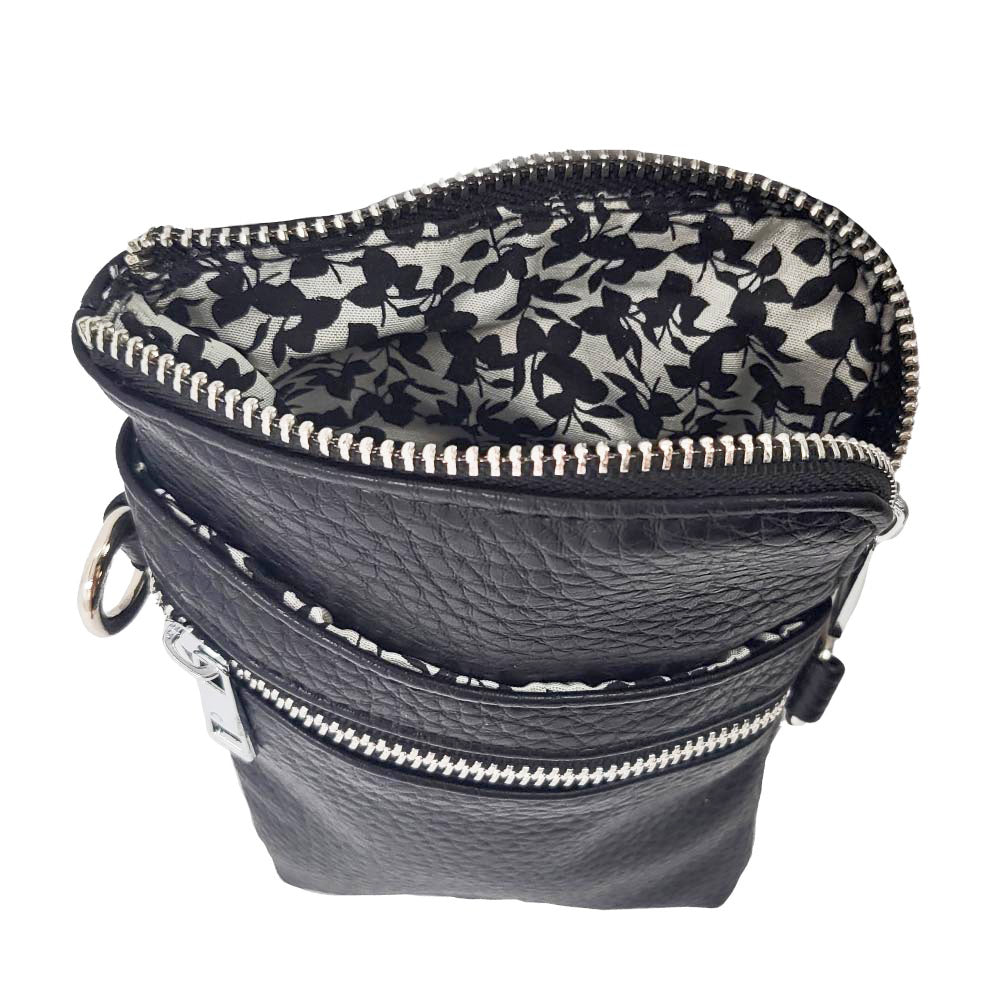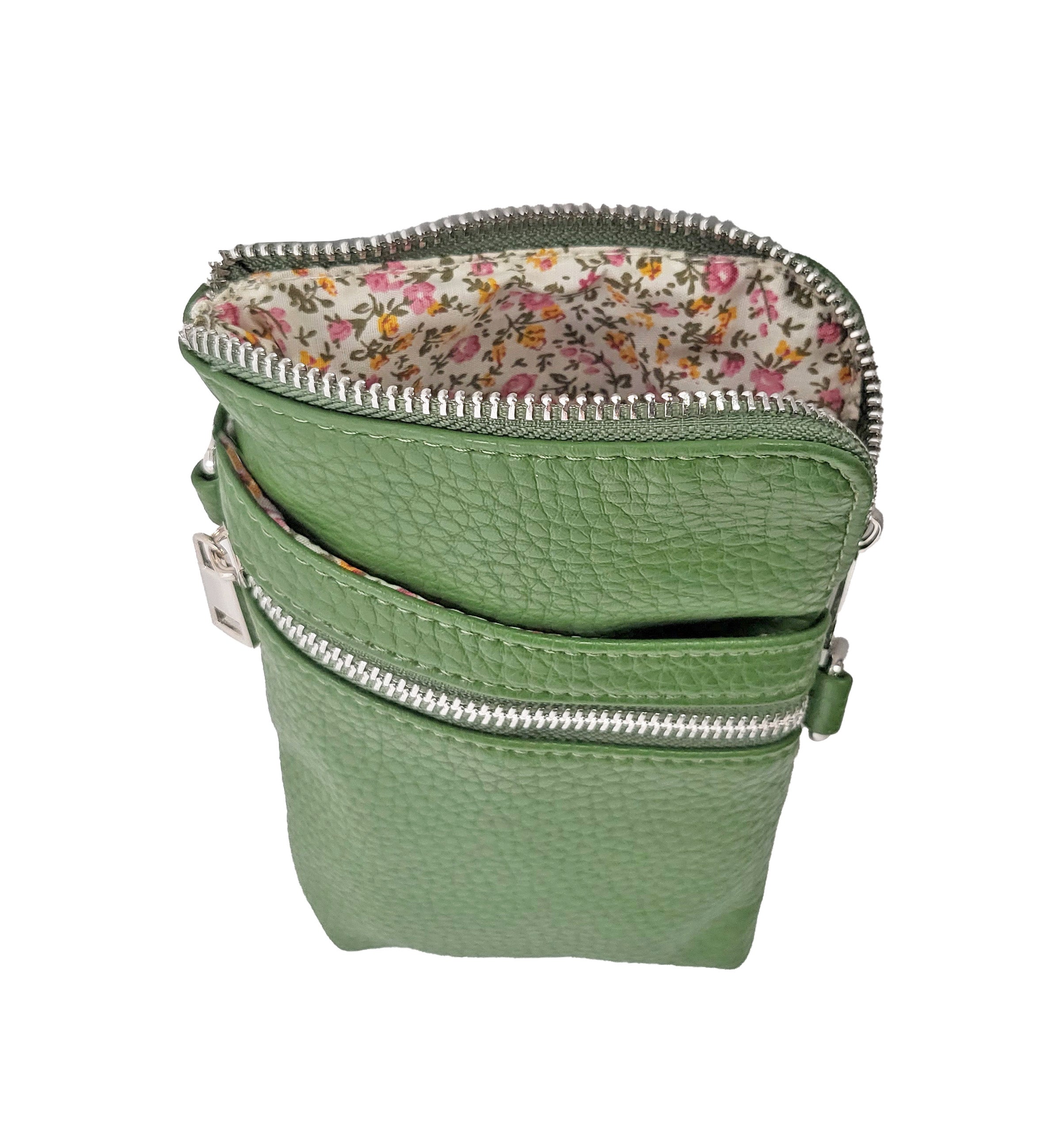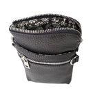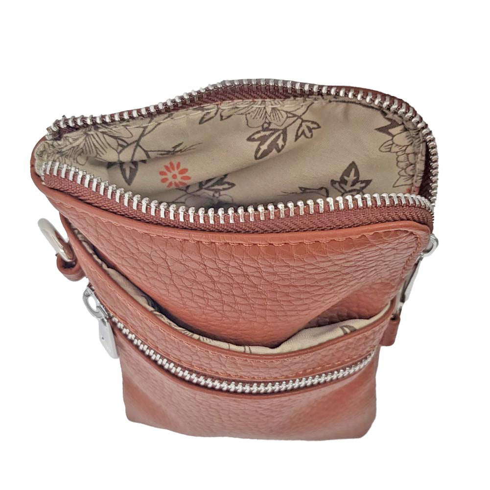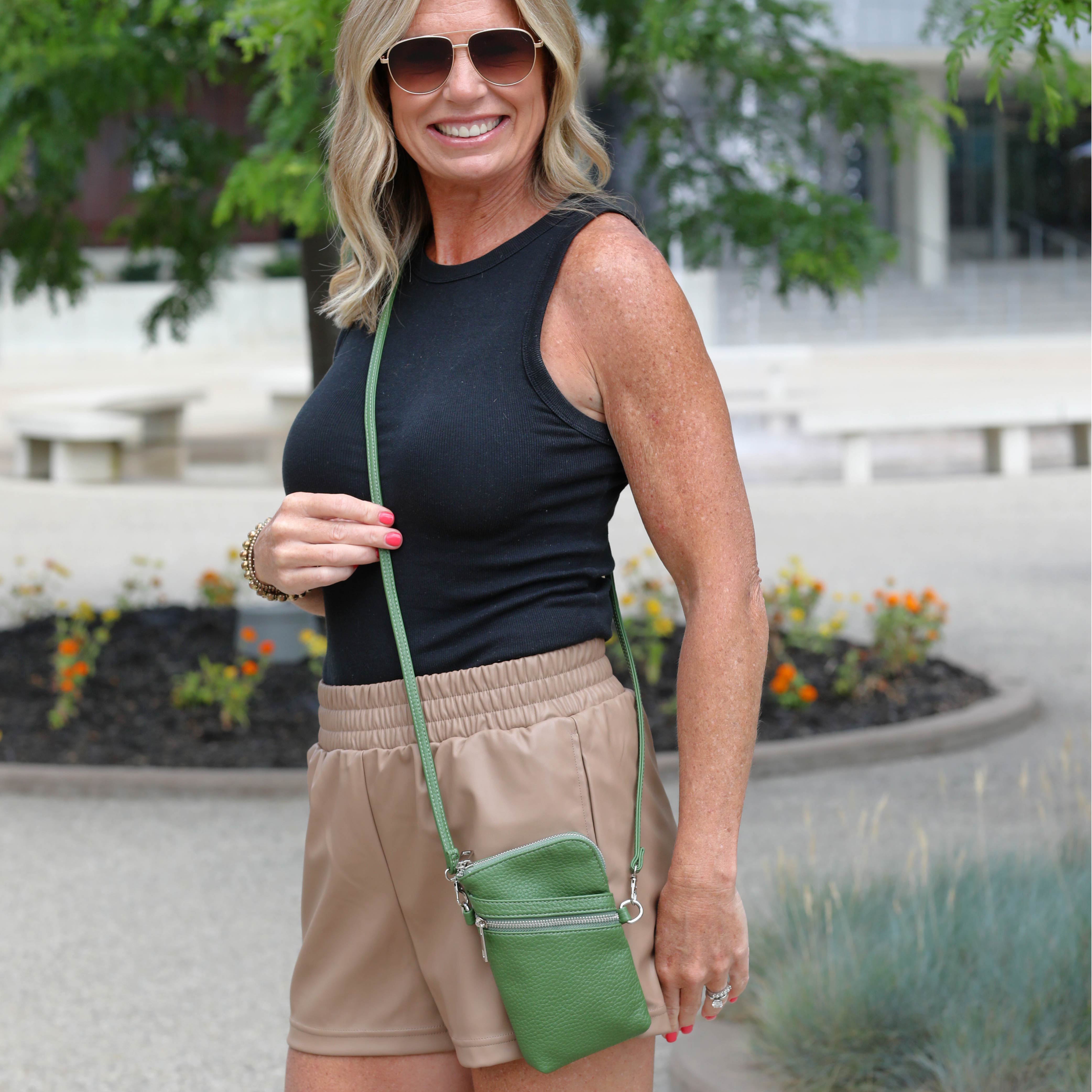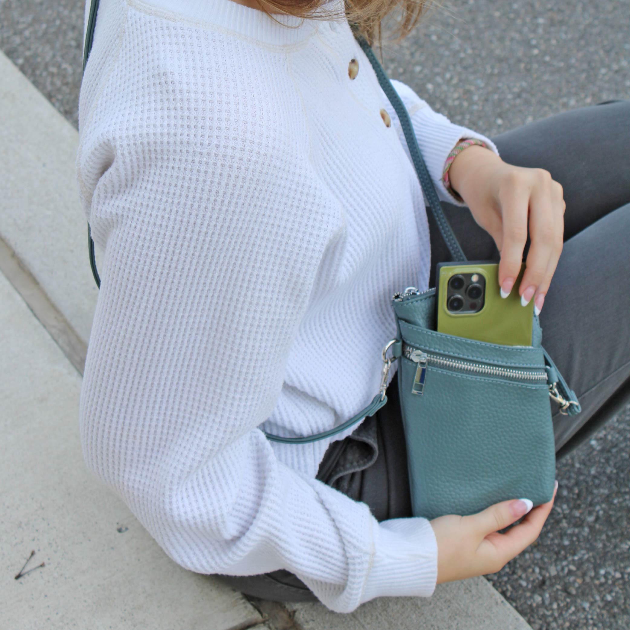 We do crossbody bags best and this new one is perfect! Metal zippers accent a grain vegan leather. Front zipper pocket can store a small card sleeve. Behind that, is an open pocket, large enough for most phones inside a case. The top zipper wraps around the side, giving you a wide opening to access your belongings easily.