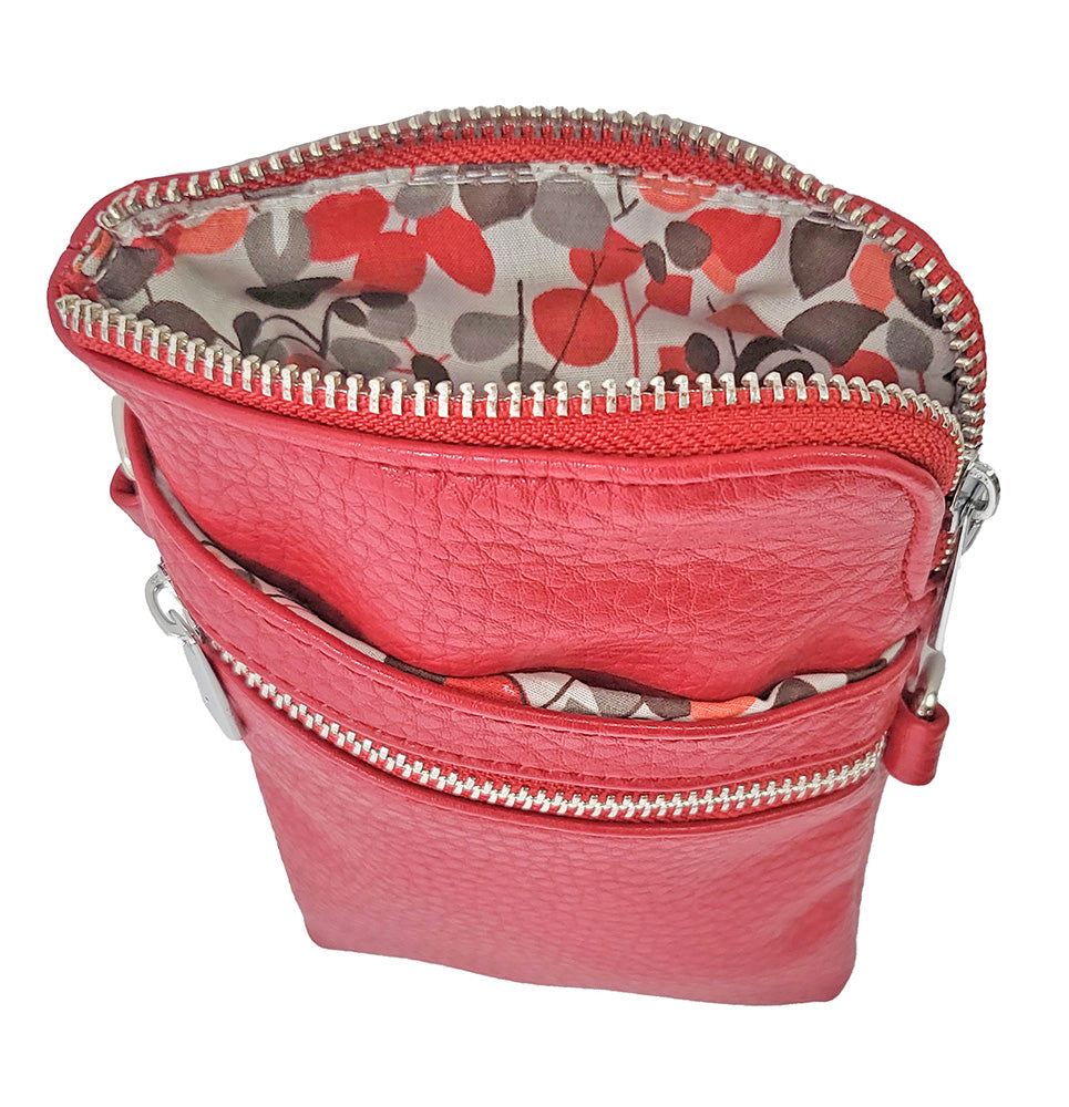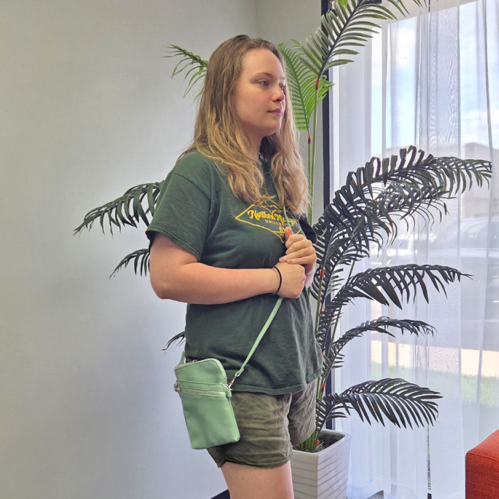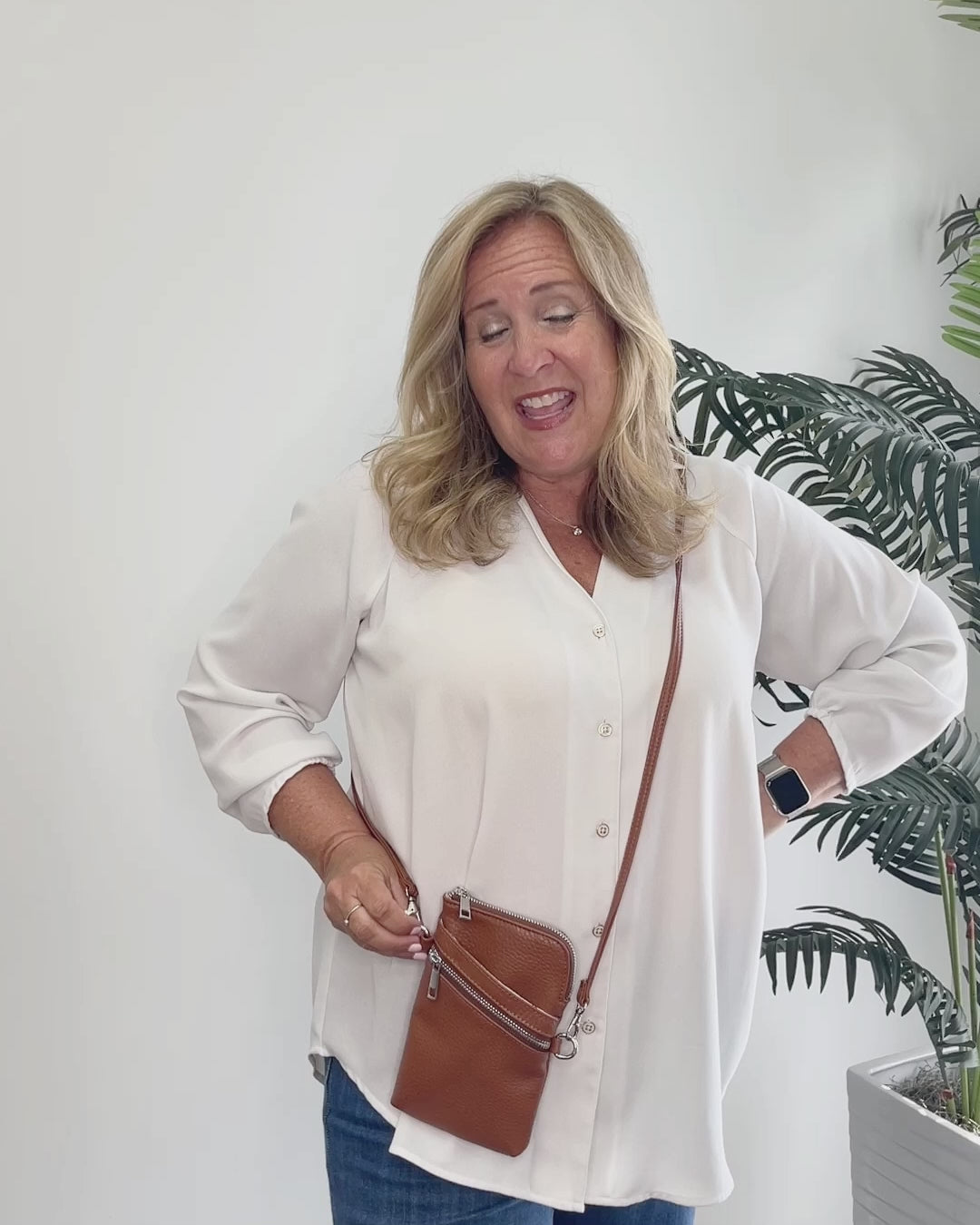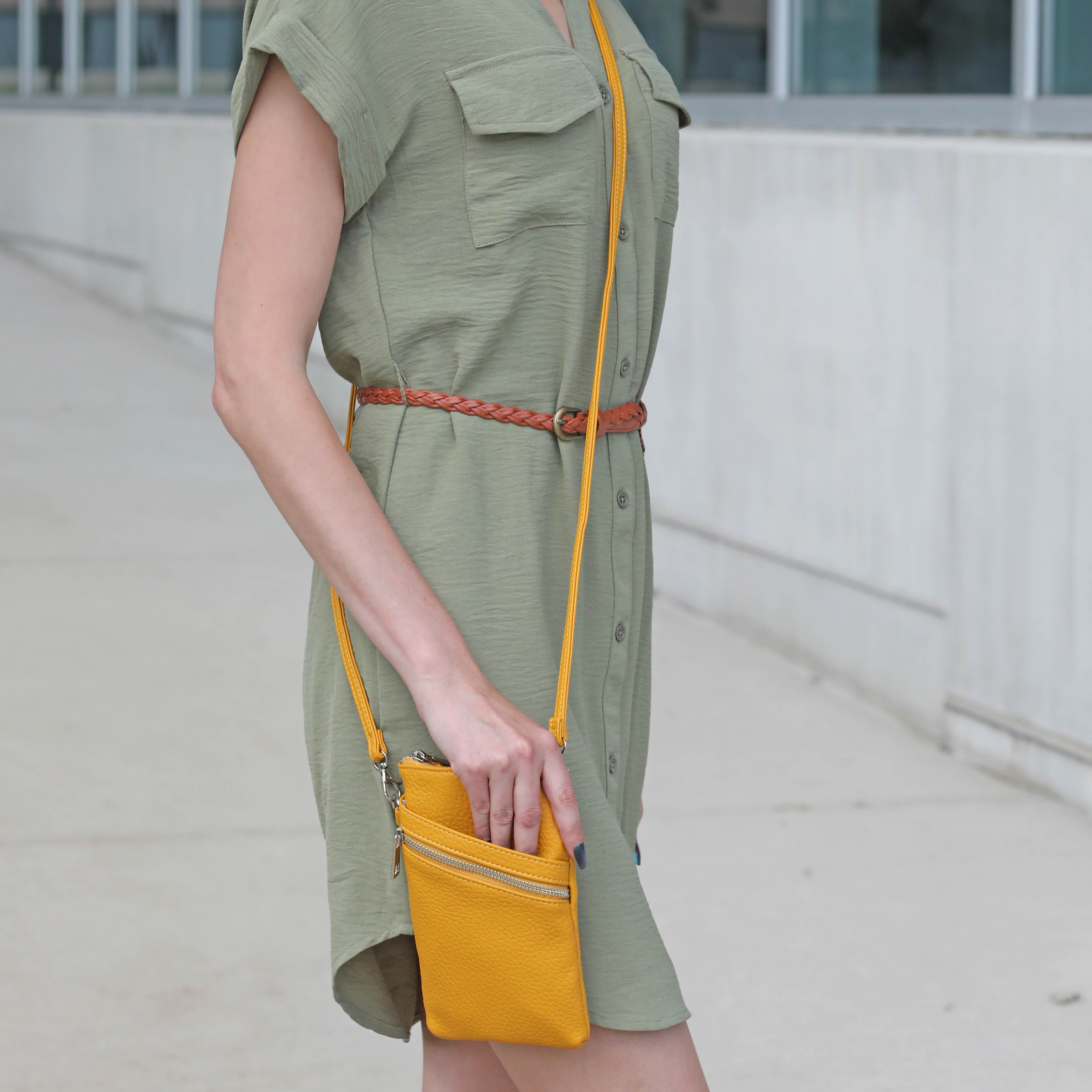 We do crossbody bags best and this new one is perfect! Metal zippers accent a grain vegan leather. Front zipper pocket can store a small card sleeve. Behind that, is an open pocket, large enough for most phones inside a case. The top zipper wraps around the side, giving you a wide opening to access your belongings easily.