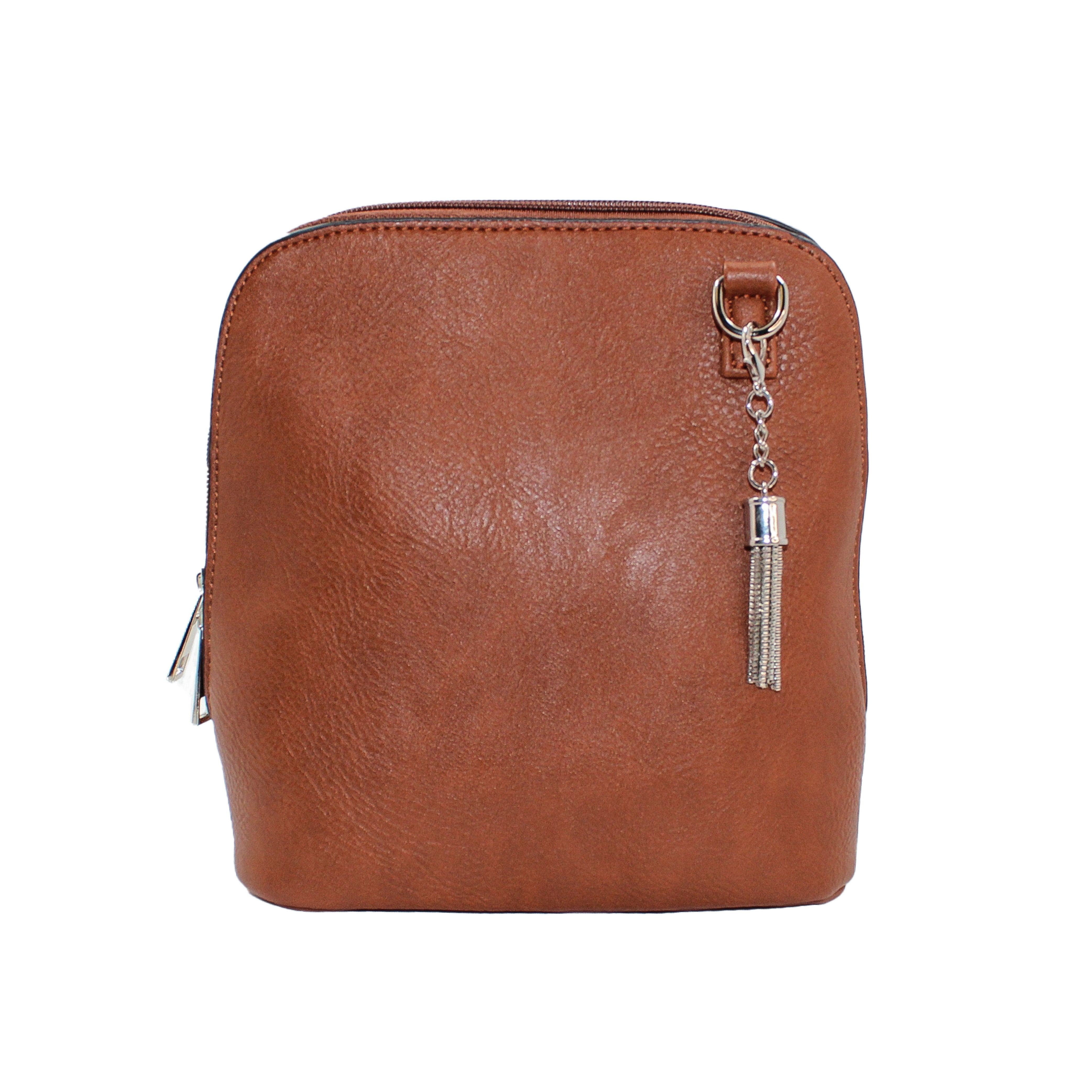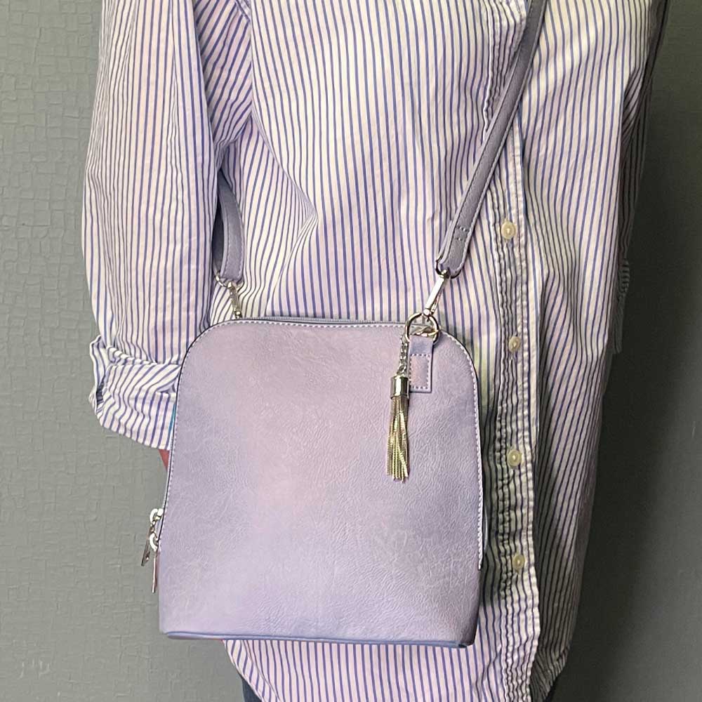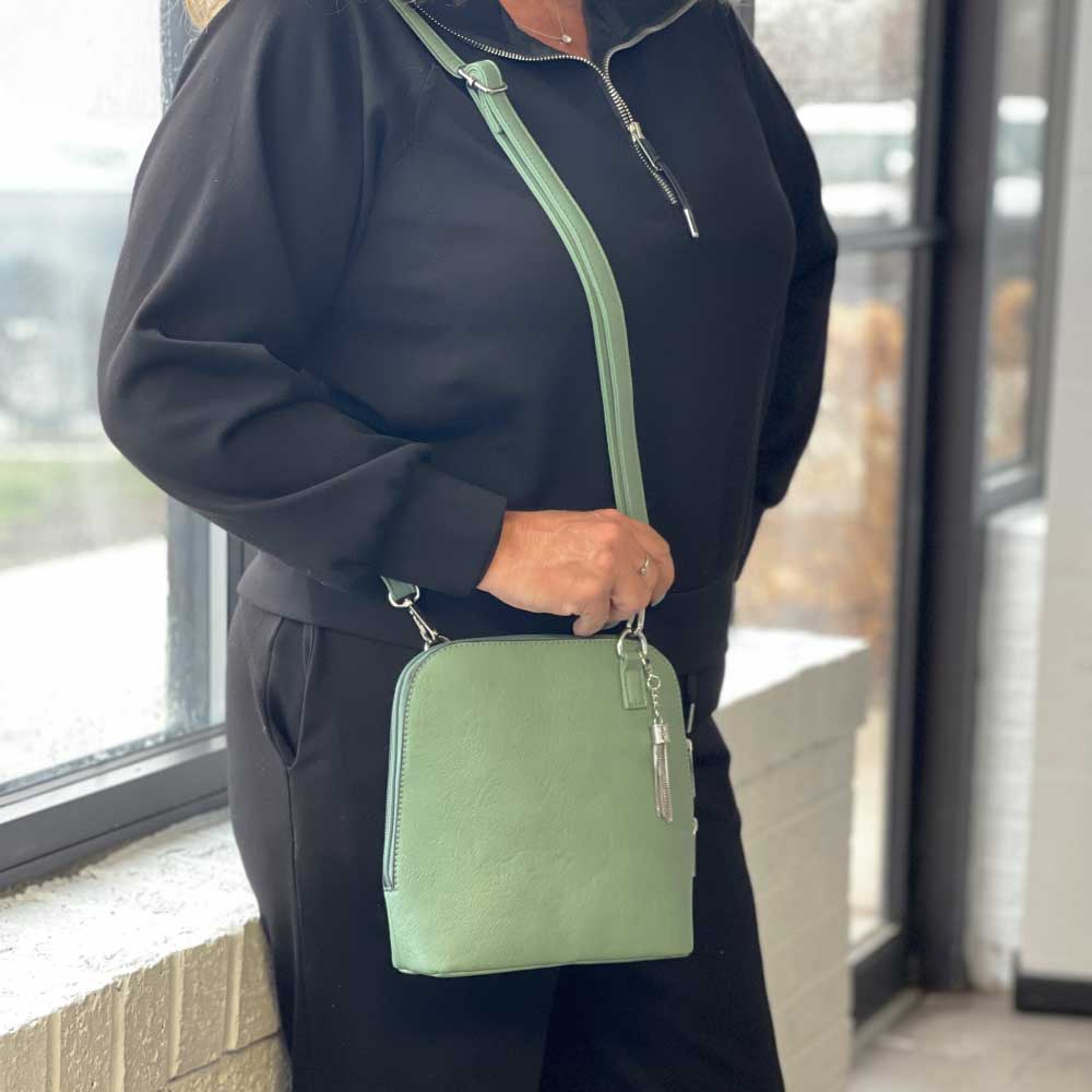 It may look small, but you will be pleasantly surprised to see how wide this bag opens. The zipper opens on all three sides giving this petite crossbody great accessibility and enough room to hold more than just the essentials! The metal tassel adds just the right finish!