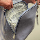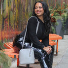- Silver hardware including metal tassel