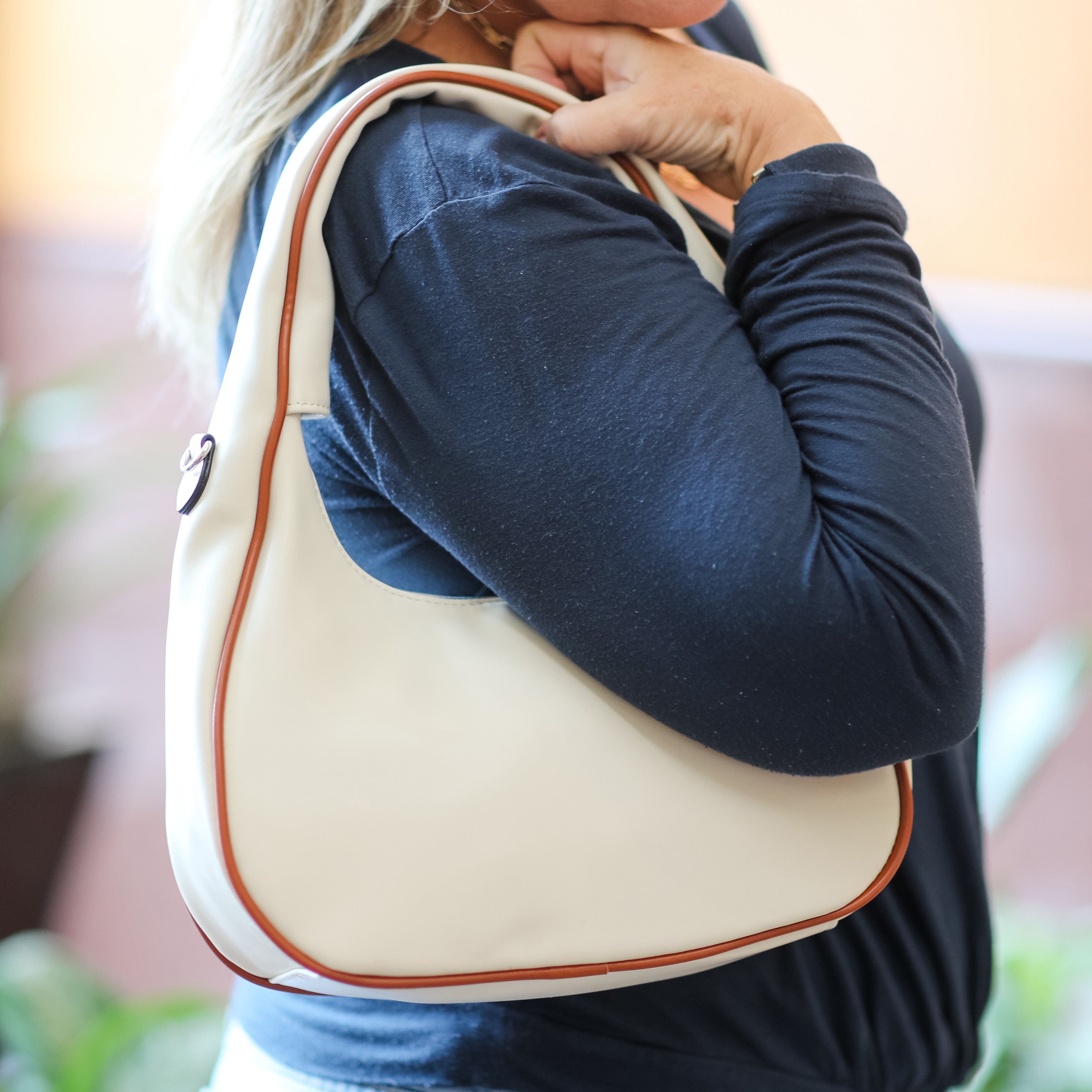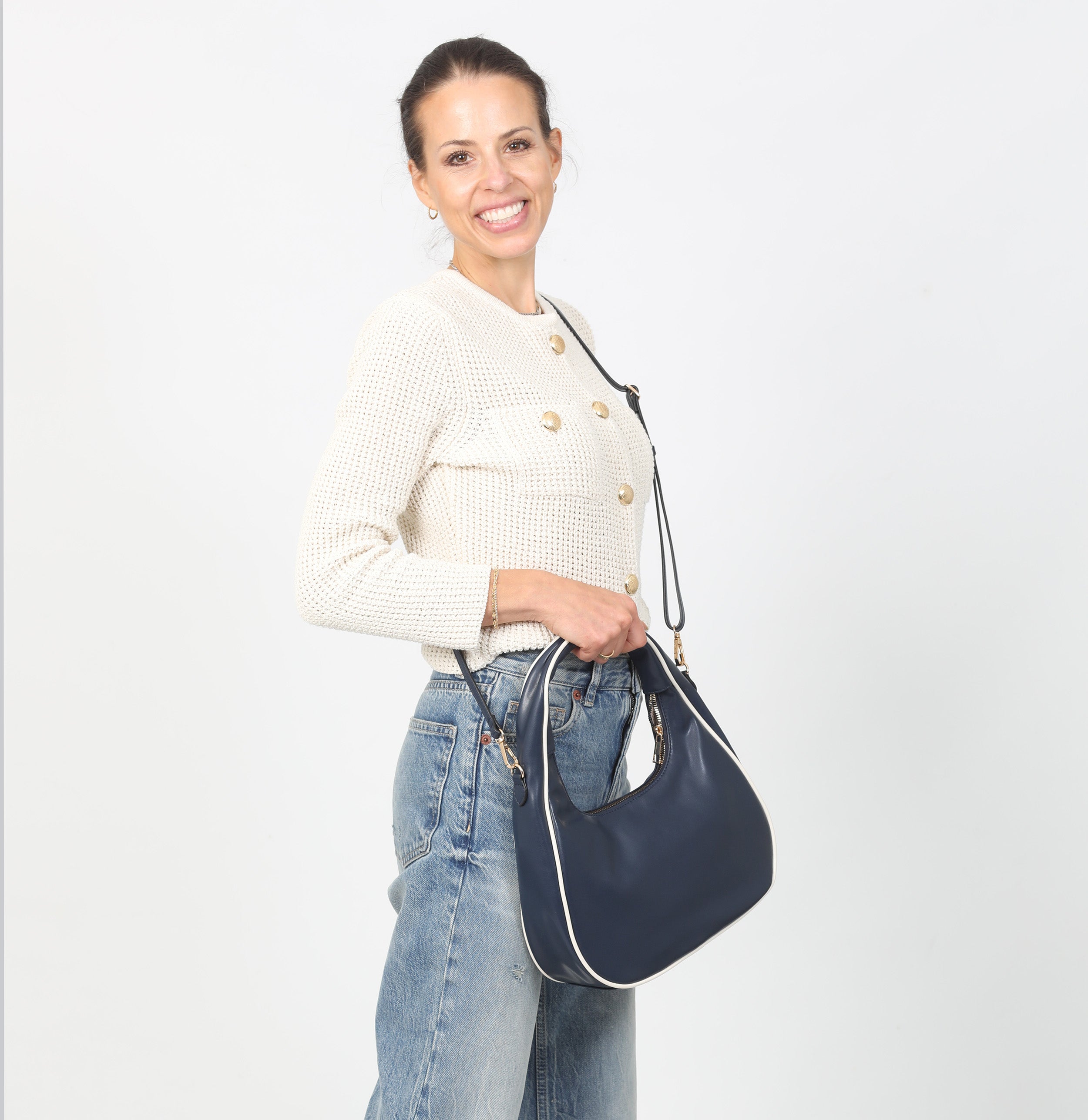 Round-shape shoulder bags are one of the season’s biggest trends, and with its standout contrast piping trim, this bag is truly having a moment. Designed with a durable metal zipper closure for a premium, secure feel. The interior offers three RFID-protected card sleeves and a zipper pocket.