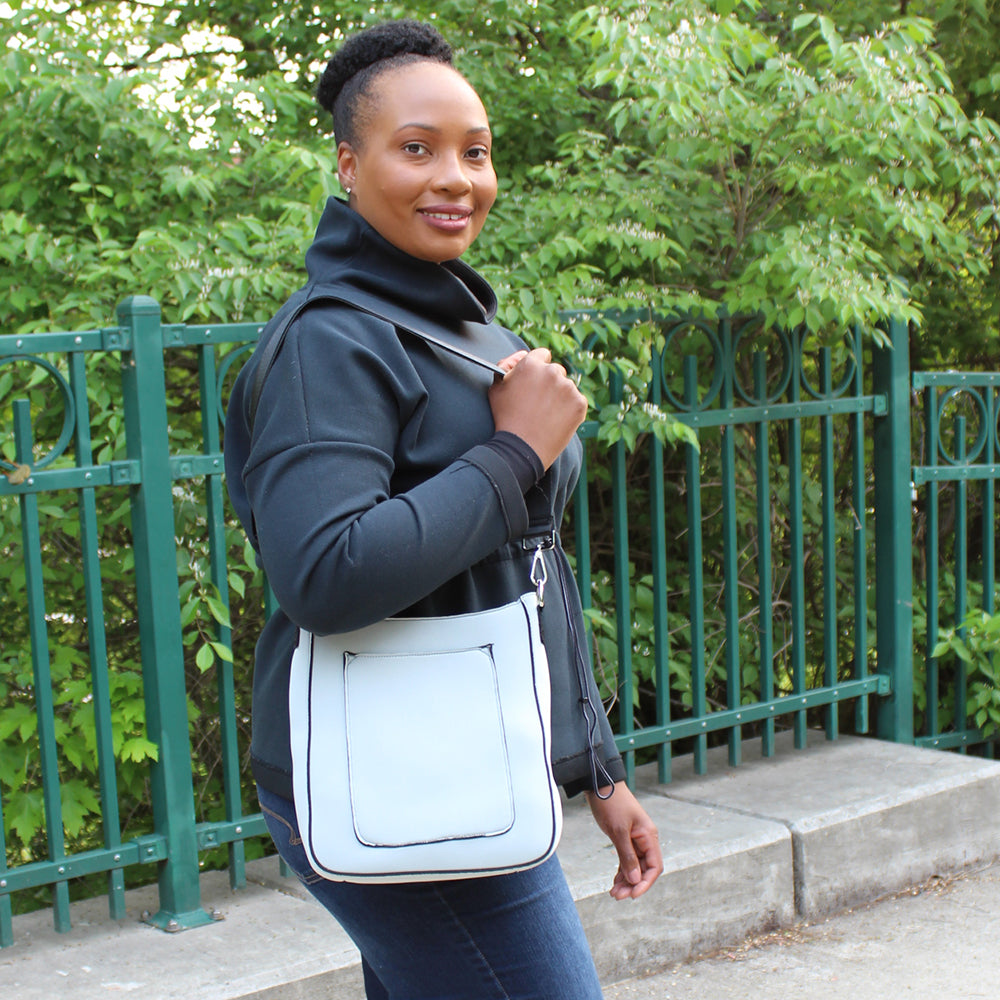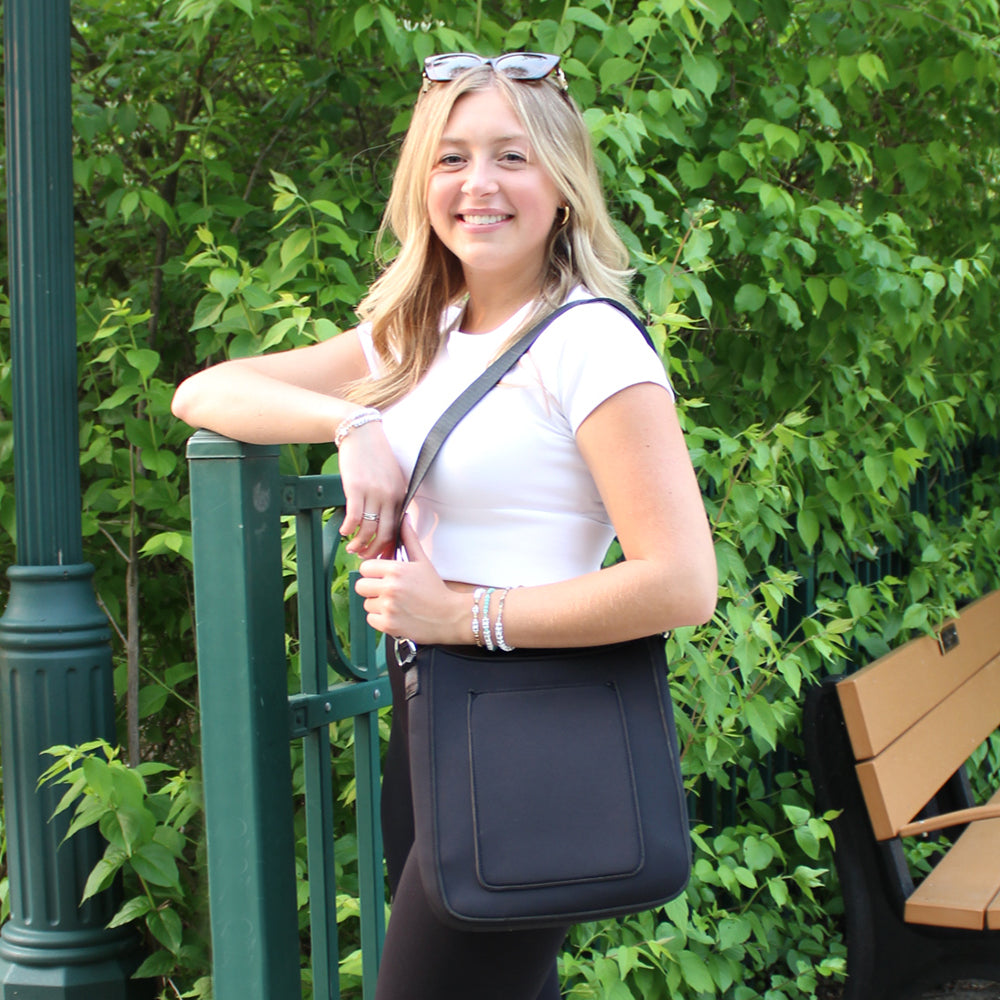 The best size bag we offer! It lays flat on your hip, with an adjustable nylon strap to wear as shoulder bag or crossbody. Inside, you’ll find 2 open pockets for your phone and organization. It has a capacity to hold a small laptop, water bottles and so much more. Made of neoprene, the bag is a fun sporty additional to your dressier handbags. It is lightweight, elastic and flexible, resistant to scratches, heat, oil, water, making it easy to clean. Named after Mia Hamm for her Olympic success, her being the best female soccer player in history.