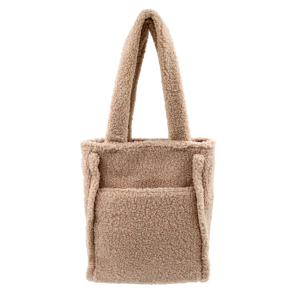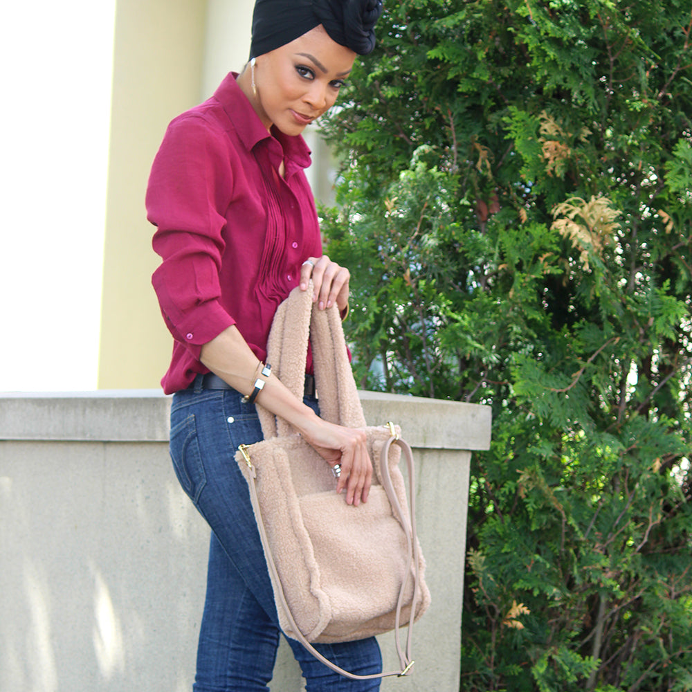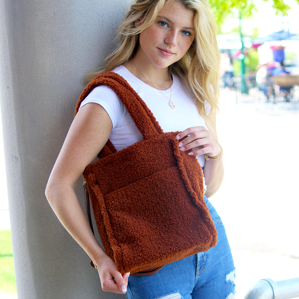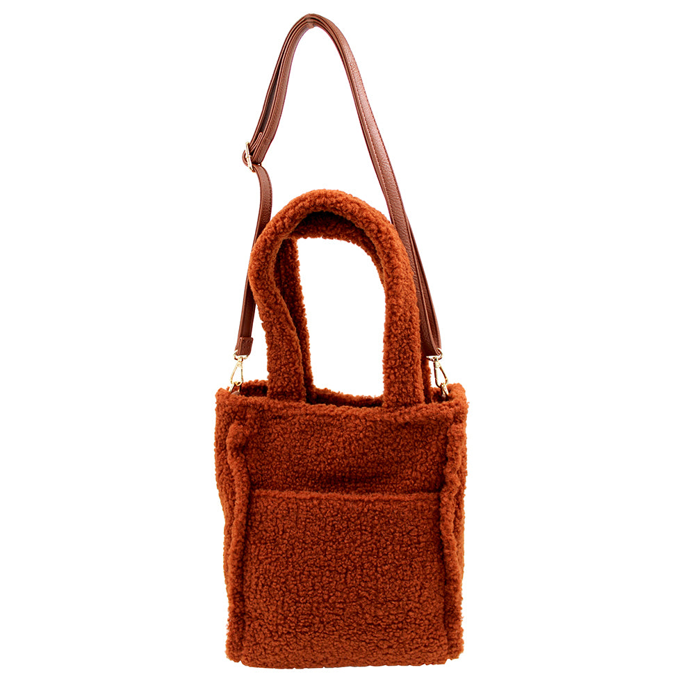 Long adjustable PU material strap. Sherpa material. Snap Closure. Interior zipper pocket and 3 built-in RFID protected card sleeves.
