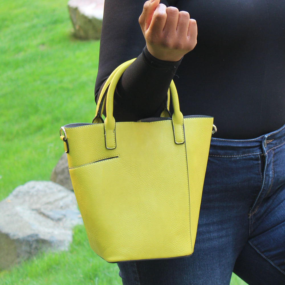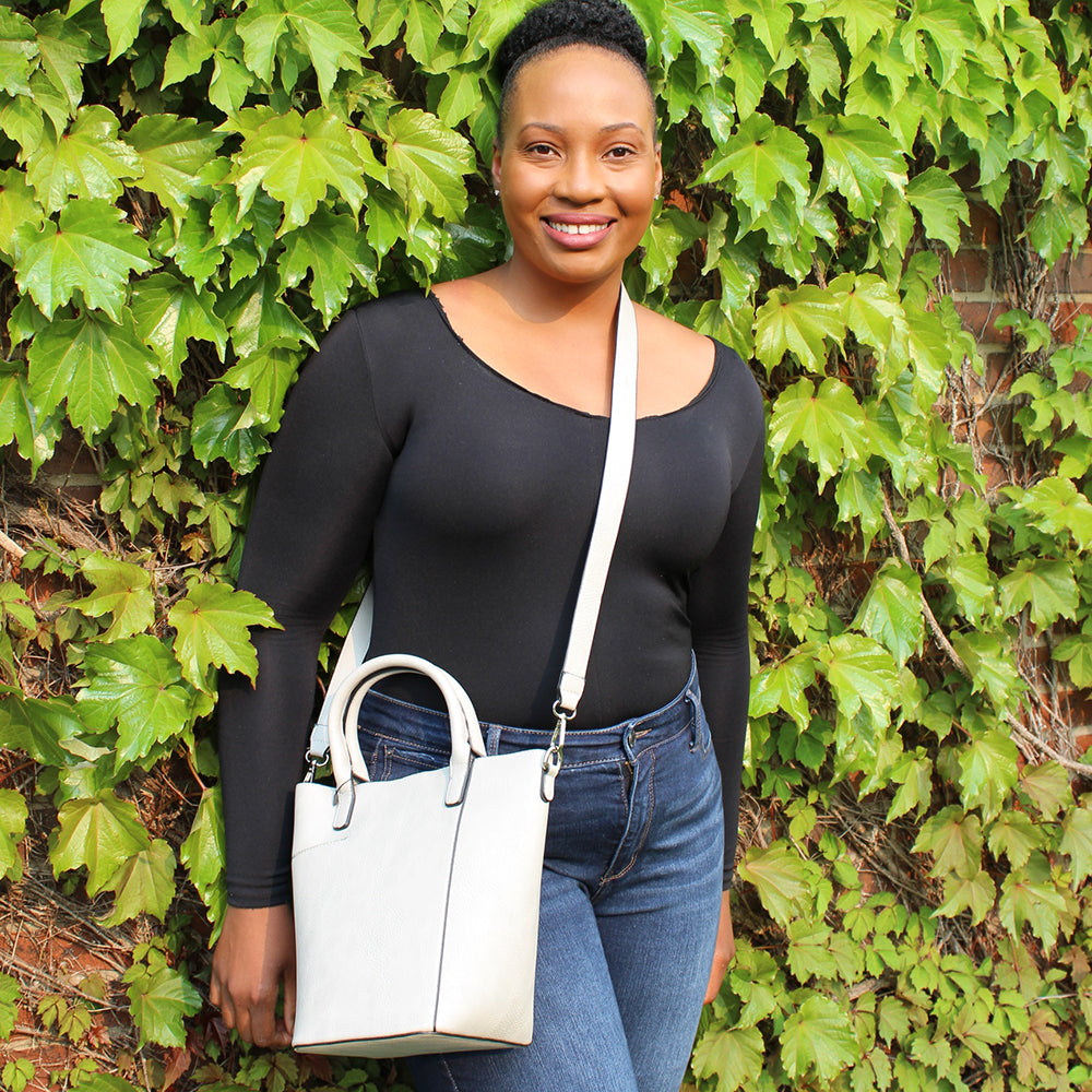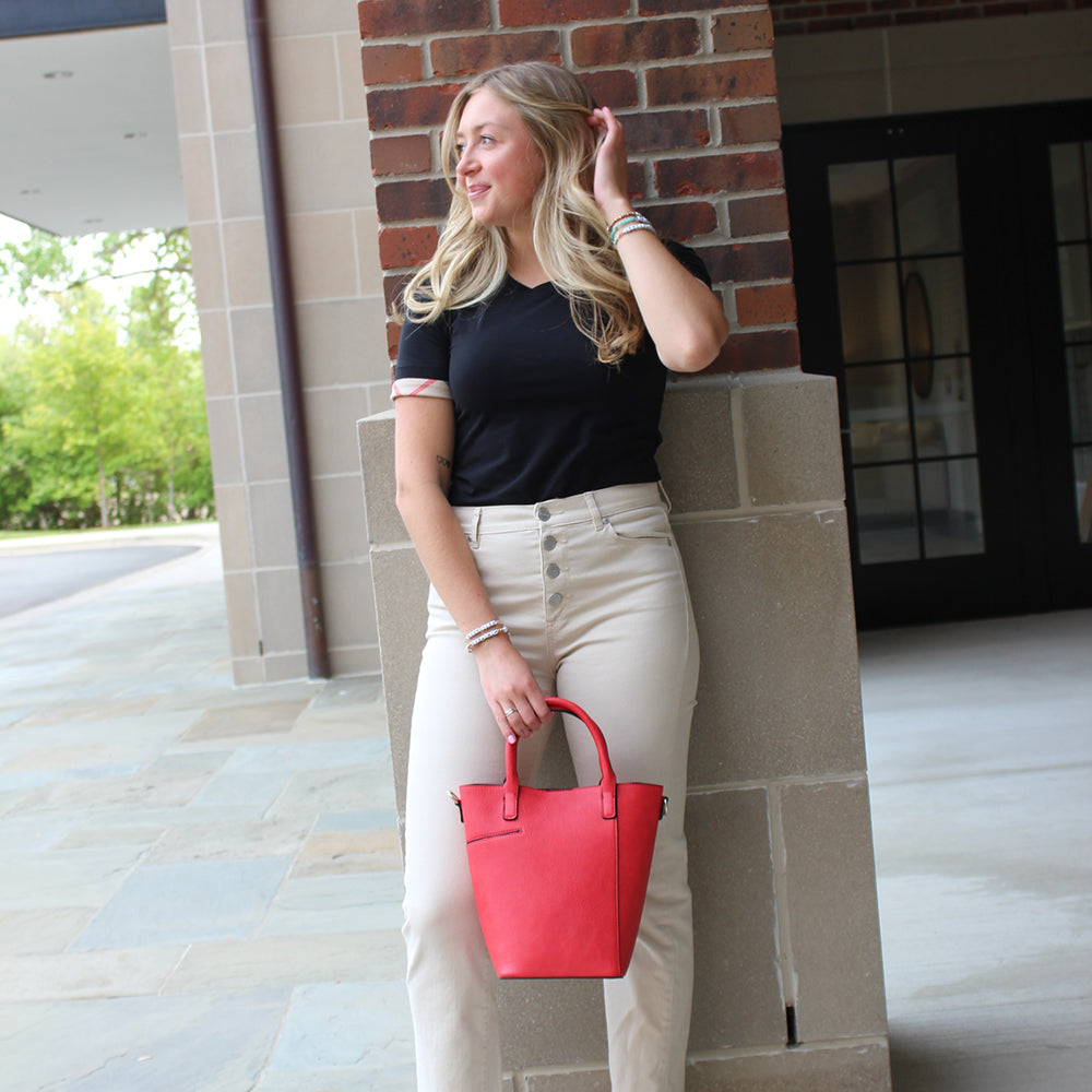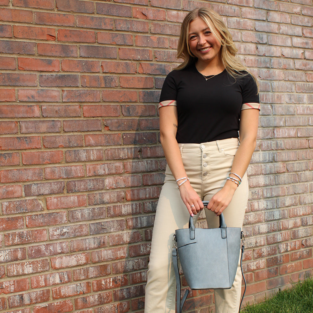 Great size, with a larger bottom this bag has great capacity to carry what you need. Wear as a satchel or crossbody. Interior has 2 RFID protected card sleeves built in, magnet snap closure and an open front pocket for your phone. Named after Mary Barra, the CEO that can do it all.