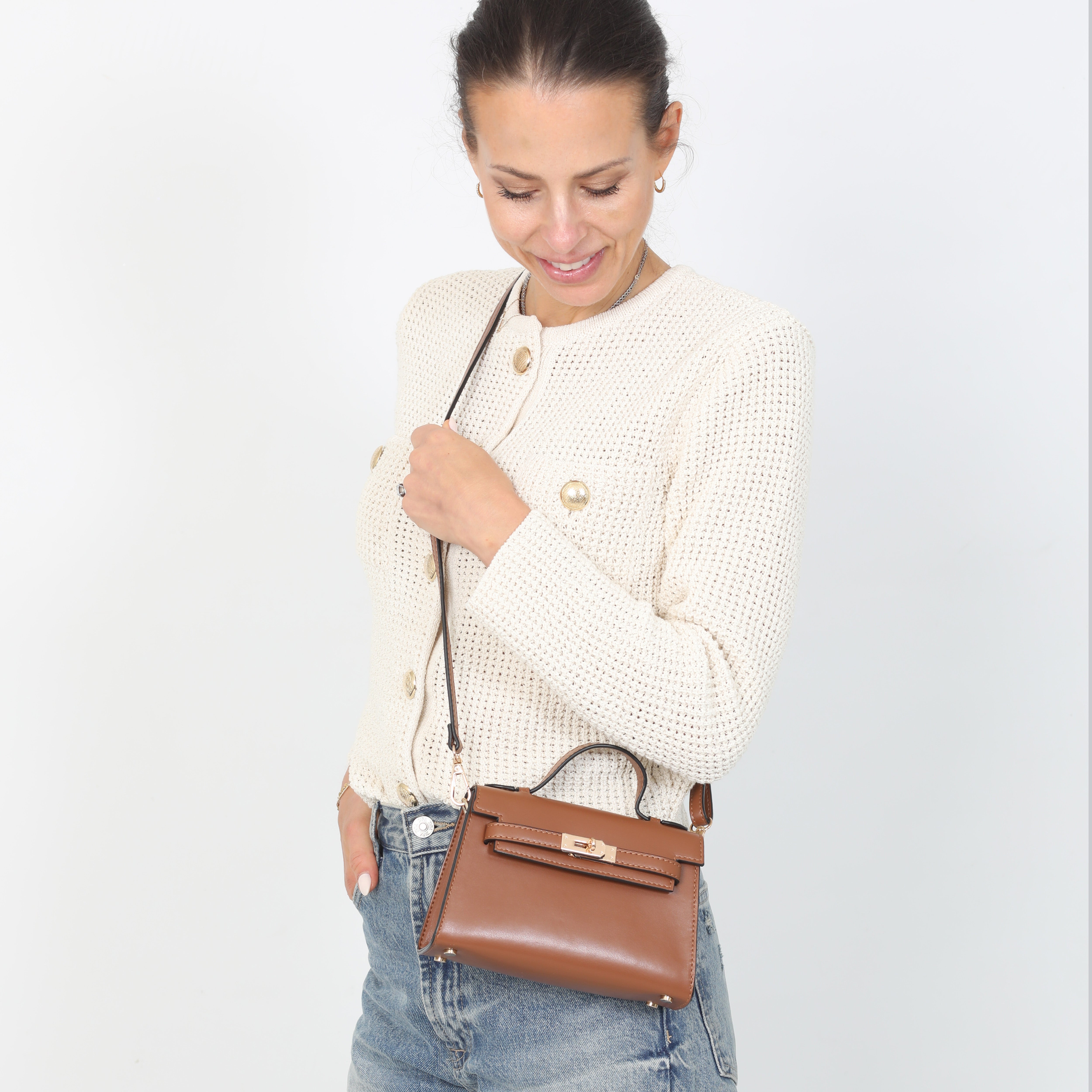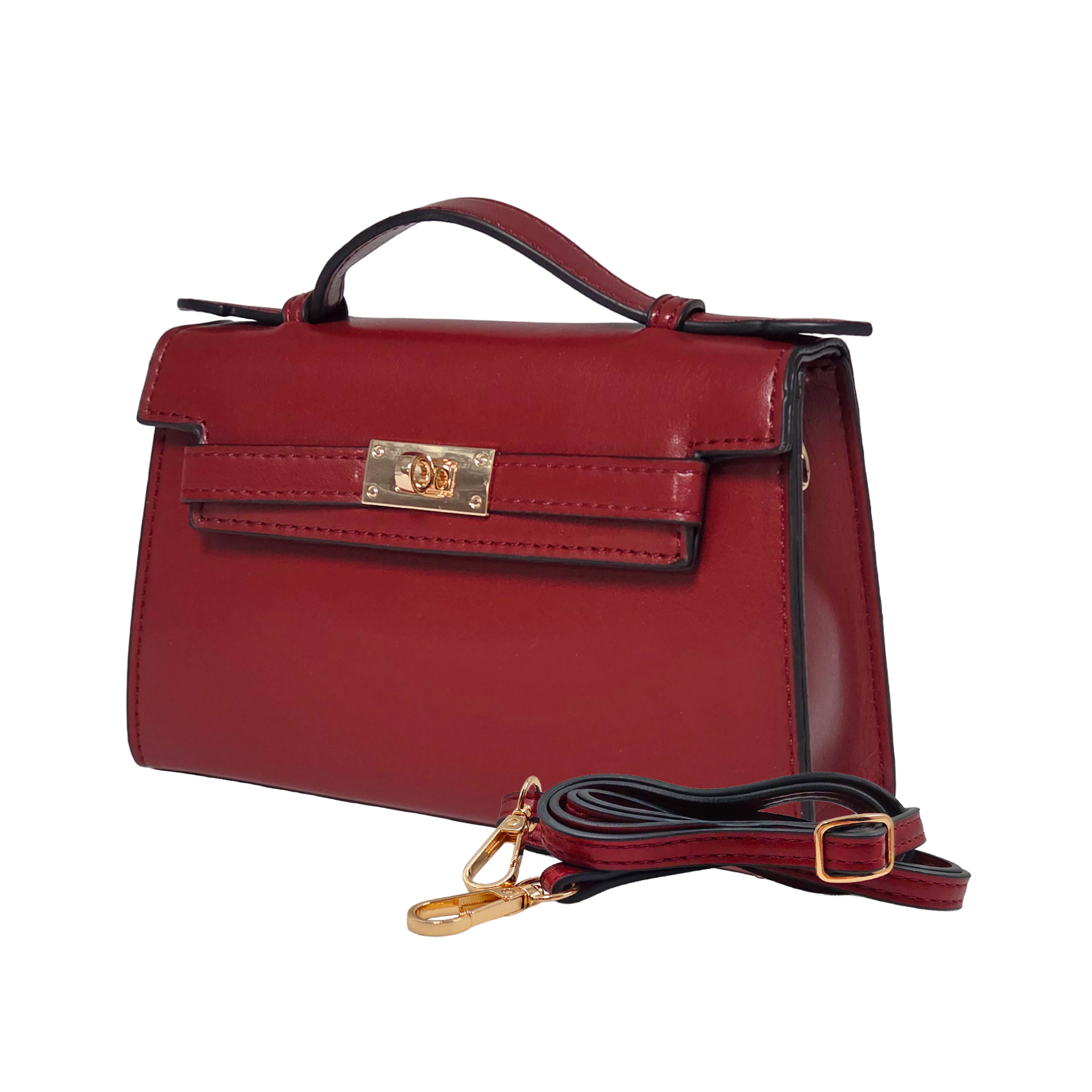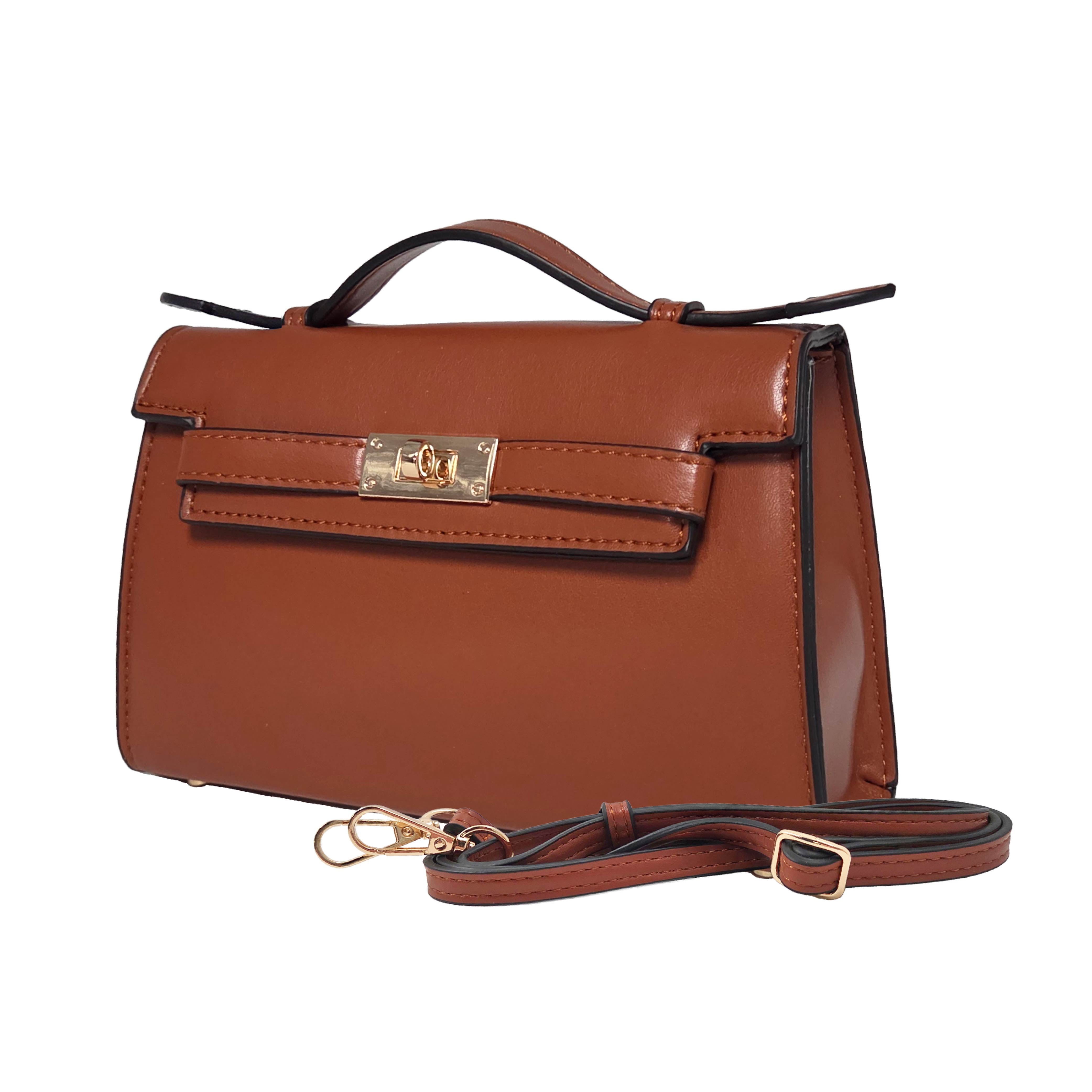 A modern, structured silhouette with a magnetic closure for effortless opening and a clean, seamless look. The top satchel handle lays flat with an adjustable crossbody strap. Inside are three built-in RFID-protected card sleeves and a secure zipper pocket.