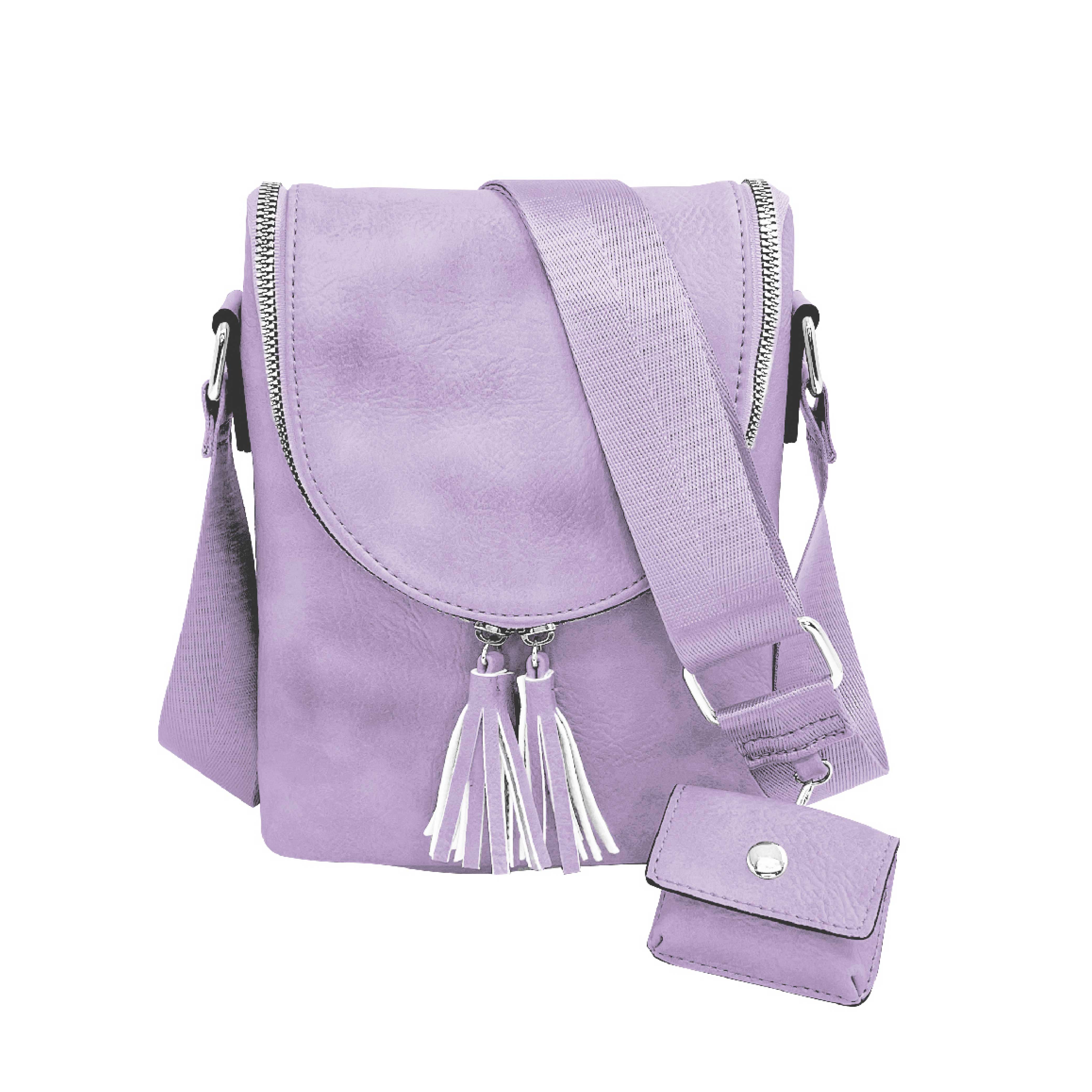 This stylish vegan leather crossbody with a unique front oval zipper opening for wide access. Adjustable nylon strap. Interior zipper pocket, silver hardware, adjustable nylon strap and2 RFID-protected credit card slots.