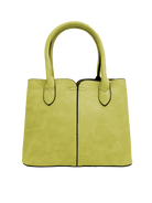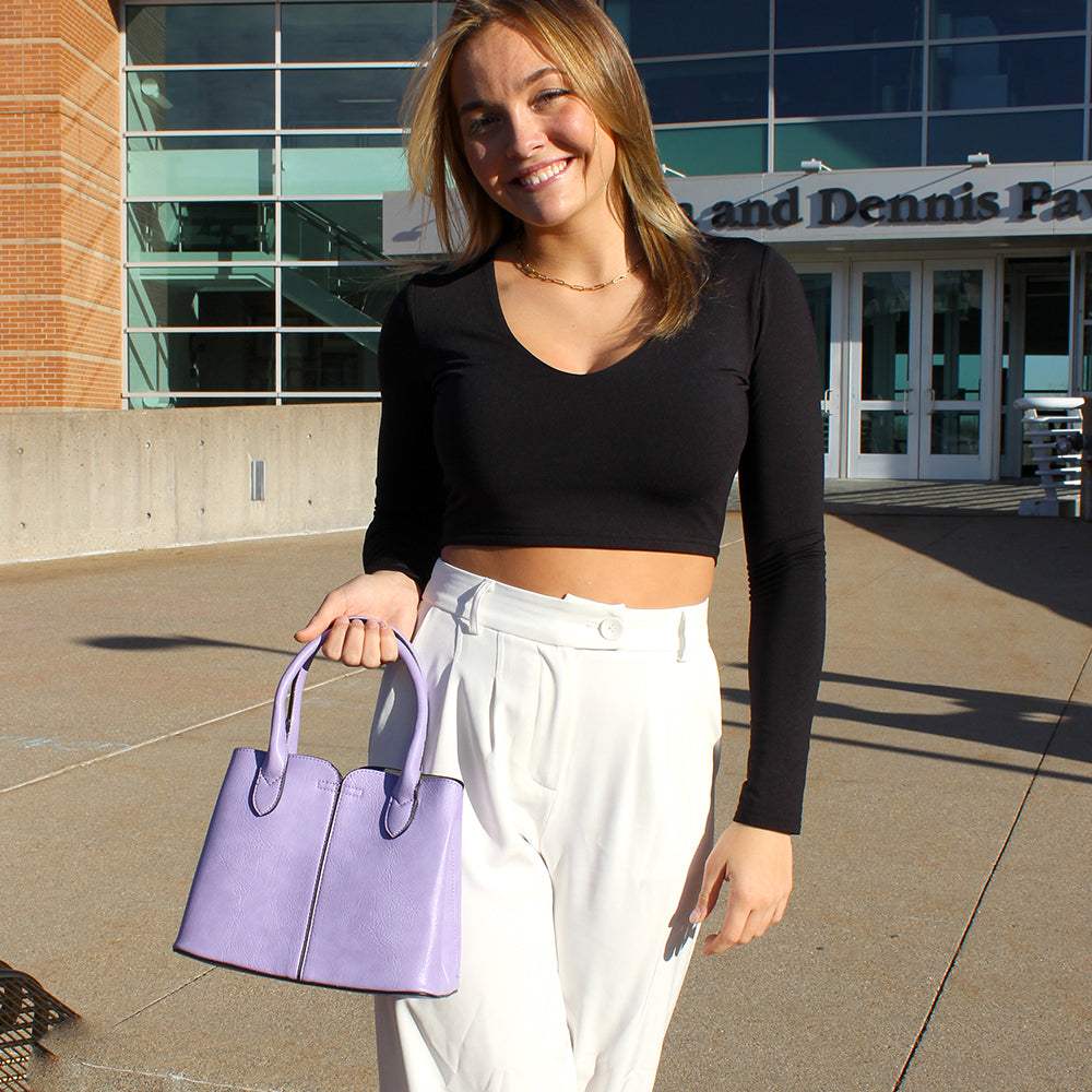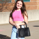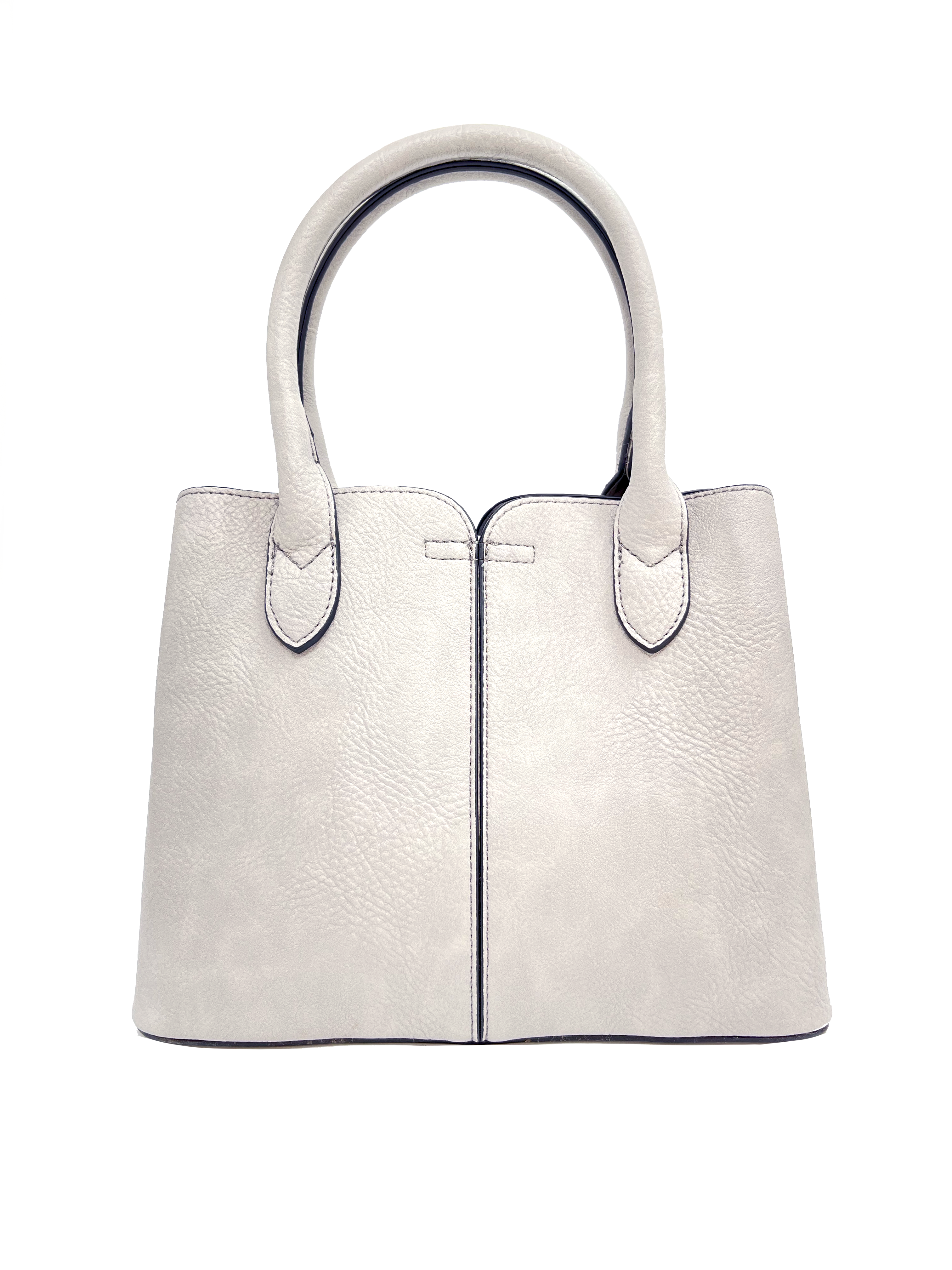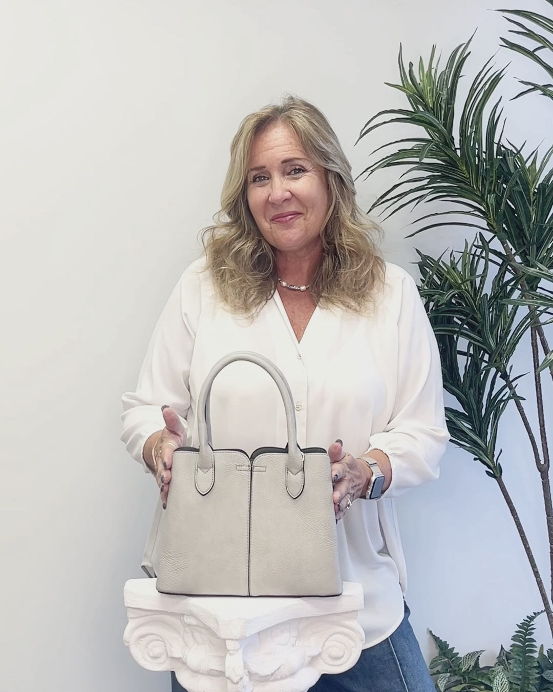 Vegan leather satchel. Detachable crossbody strap, 3 compartments. Center zipper close, two side compartments, snap closure. Includes 2 built-in RFID-protected card