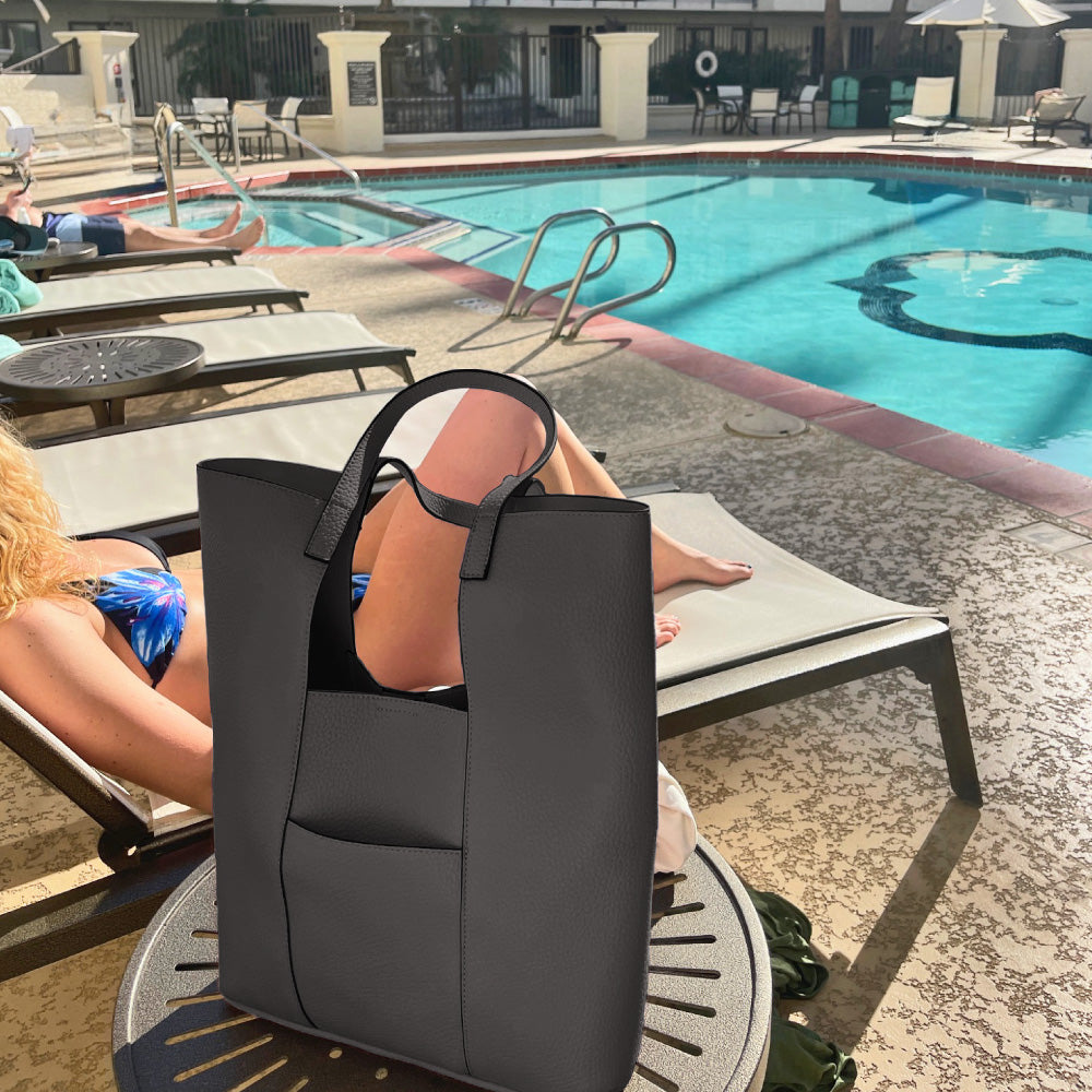Two bags in one! This versatile tote comes with a detachable crossbody inside, perfect for added organization or to use as a separate bag. The exterior features a convenient open pocket to easily grab your phone, while the square cut-out design ensures the tote fits comfortably under your arm. Style meets functionality in this must-have accessory!