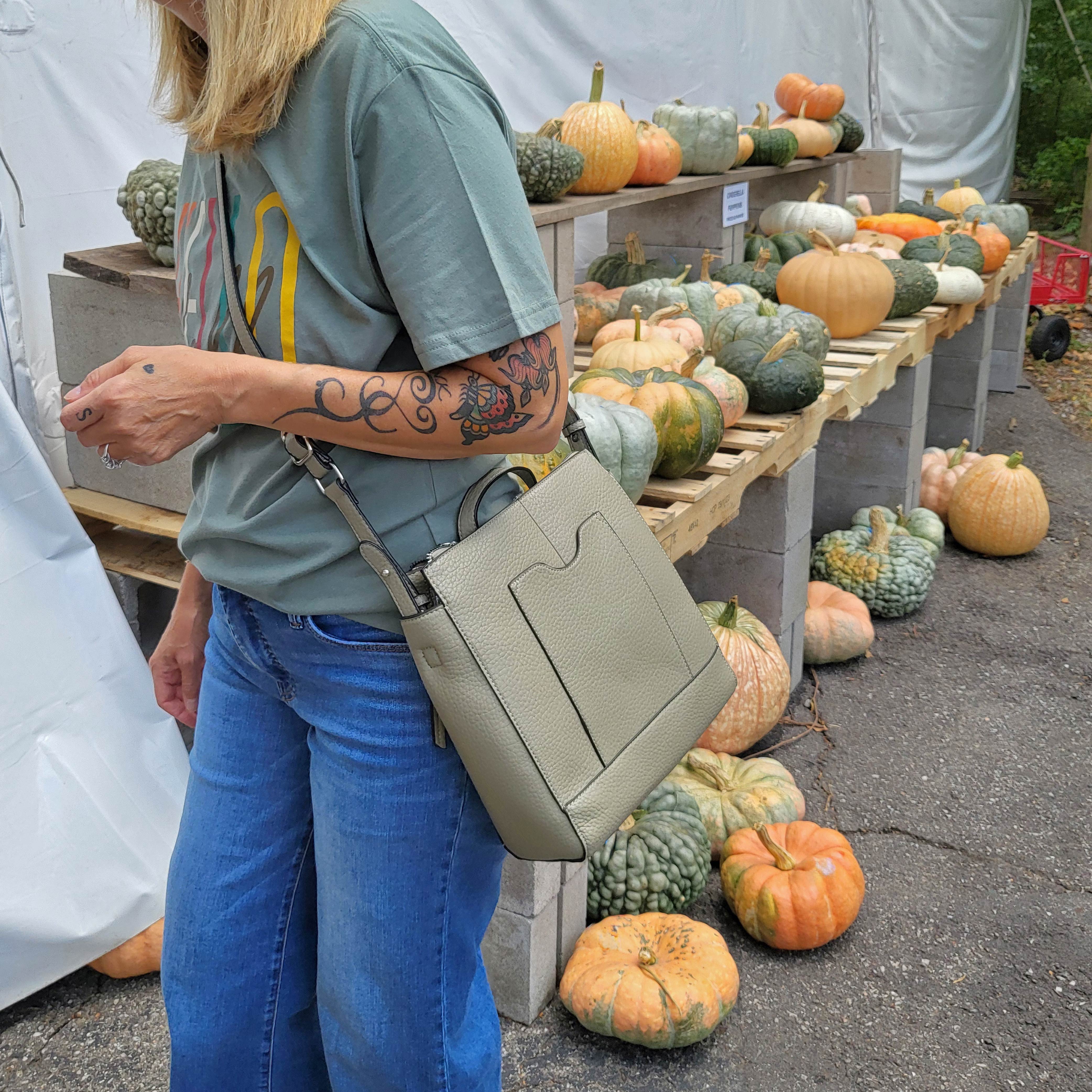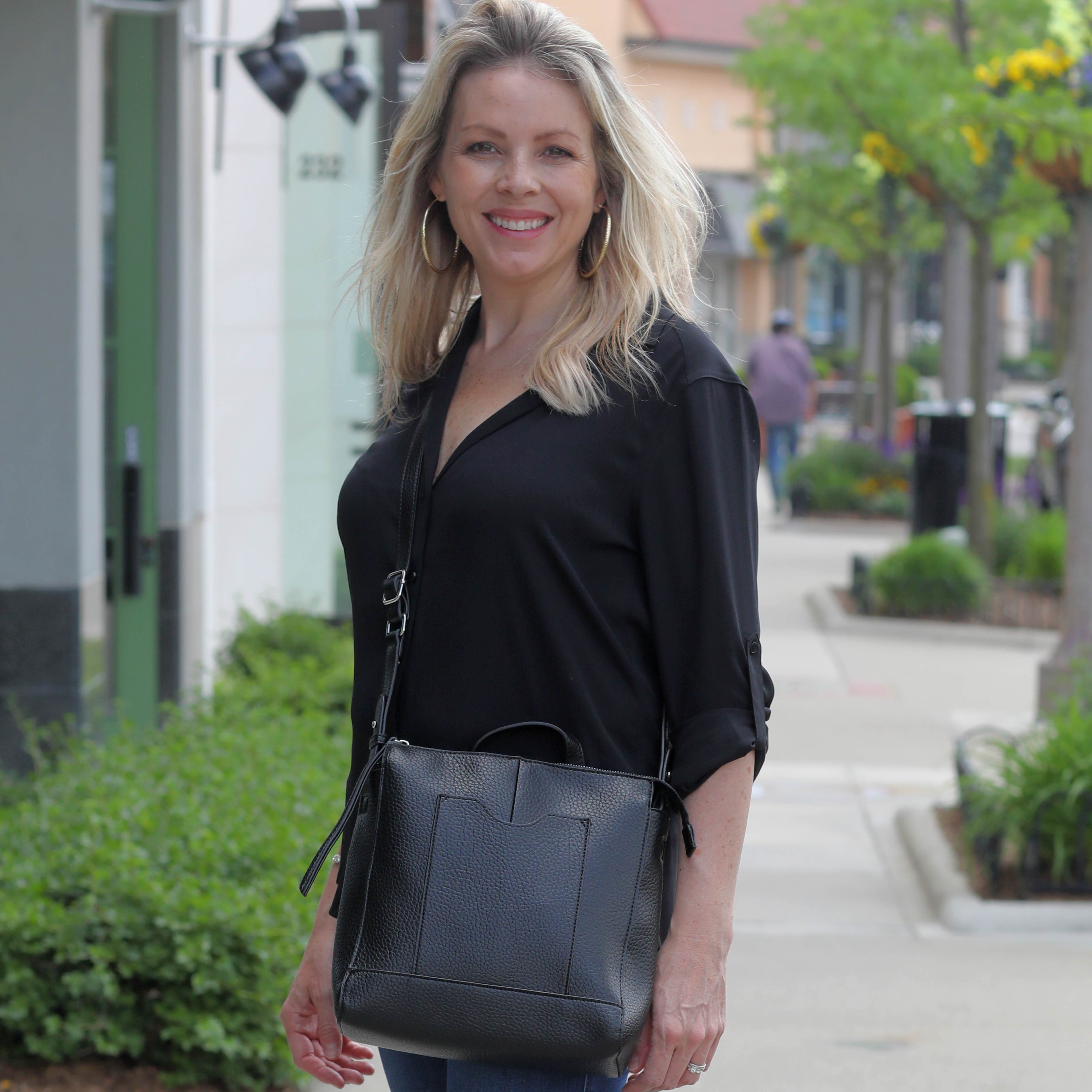 • Open front pocket, back zipper pocket, and interior zipper pocket